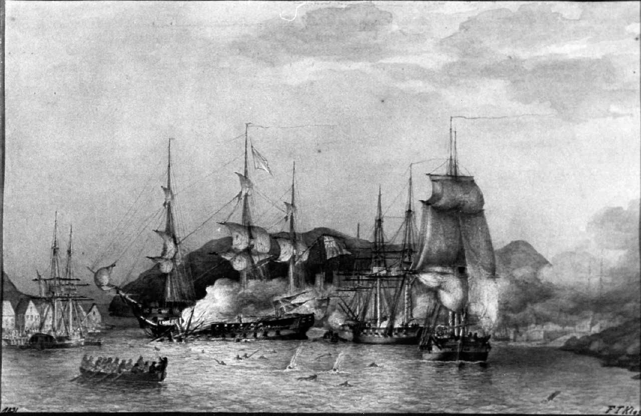 Tuschlavering og bly. Kampscene, slaget ved Lyngør 1812: I midten den brændende fregat Najaden med Dannebrog fastgjort til mesanmastens stump. Bag denne anes engelsk linieskib. Begge set mod bagbord. Til venstrehusrække med gavle og foran disse kaj med fortøjet handelsbrig. Til højre for fregatten orlogsbrig set agten for tværs mod bagbord med sejl beslået. Nærmere beskueren og noget til højre en brig set mod stævnen. Helt i baggrunden bjerge og i forgrunden svømmende mennesker. Til venstre et rofartøj set agten for tværs mod bagbord. Gråt passepartou med indvendig forgyldt kant. Poleret ramme af træ profileret og forkroppede hjørner. Sign. F.I. Kloss 1831
