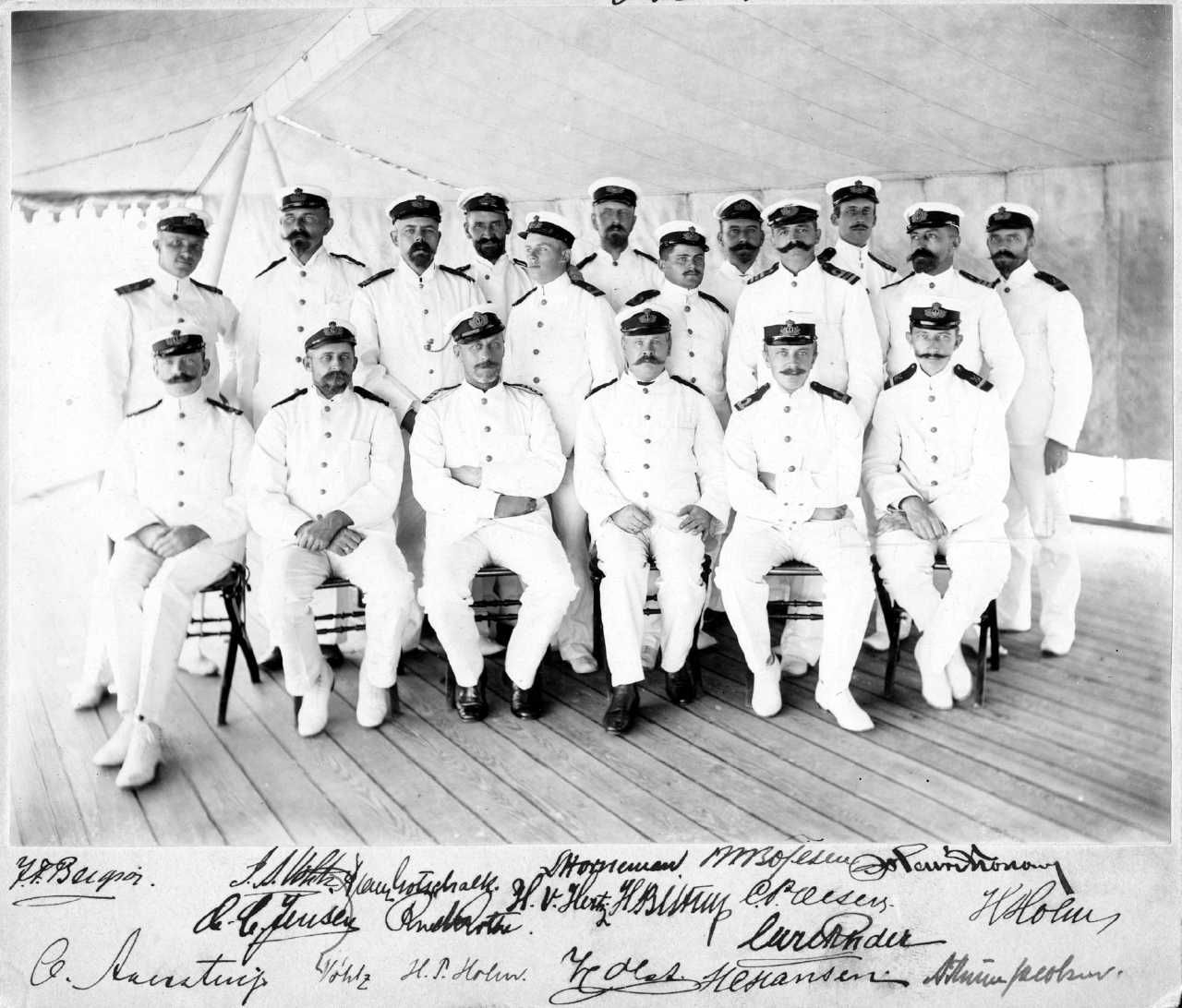 Foto: Officerskorpset om bord i "Valkyrien" fotograferet på agterdækket forsynet med solsejl. Sign. Af korpsets enkelte medlemmer. Dat. 1902.