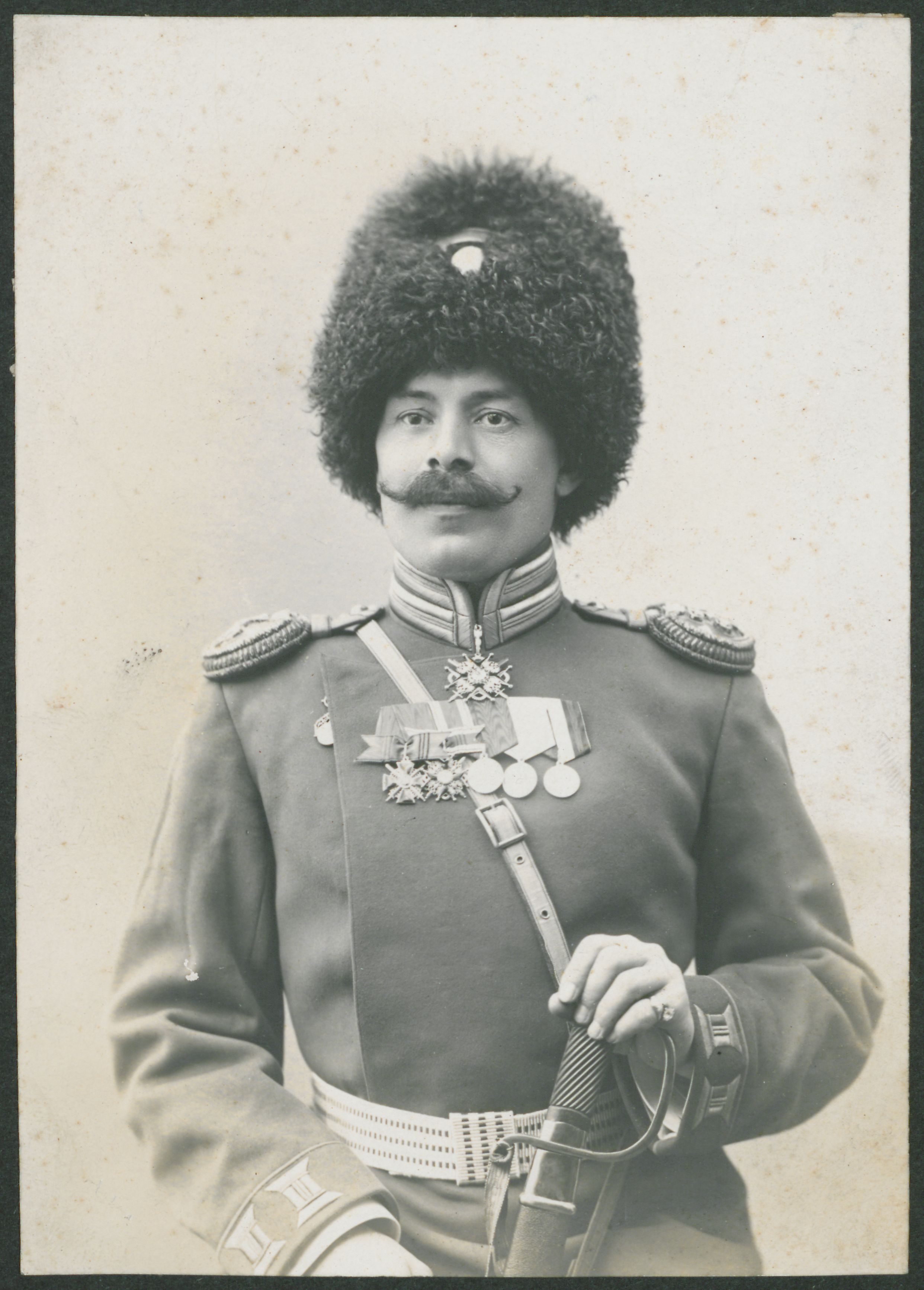 Fotografisk portræt af ukendt officer iført oberst-uniform med dekorationer på brystet.