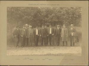 Foto: Gruppebillede 1908, ved skydeplads Meppen. Civilklædte danske og tyske teknikere i forbindelse med indkøb af artilleri fra Krupp. Flad mahogniramme. (NB mulig fejl i registraturen. Er andre registreret som OM 1963:0724