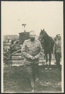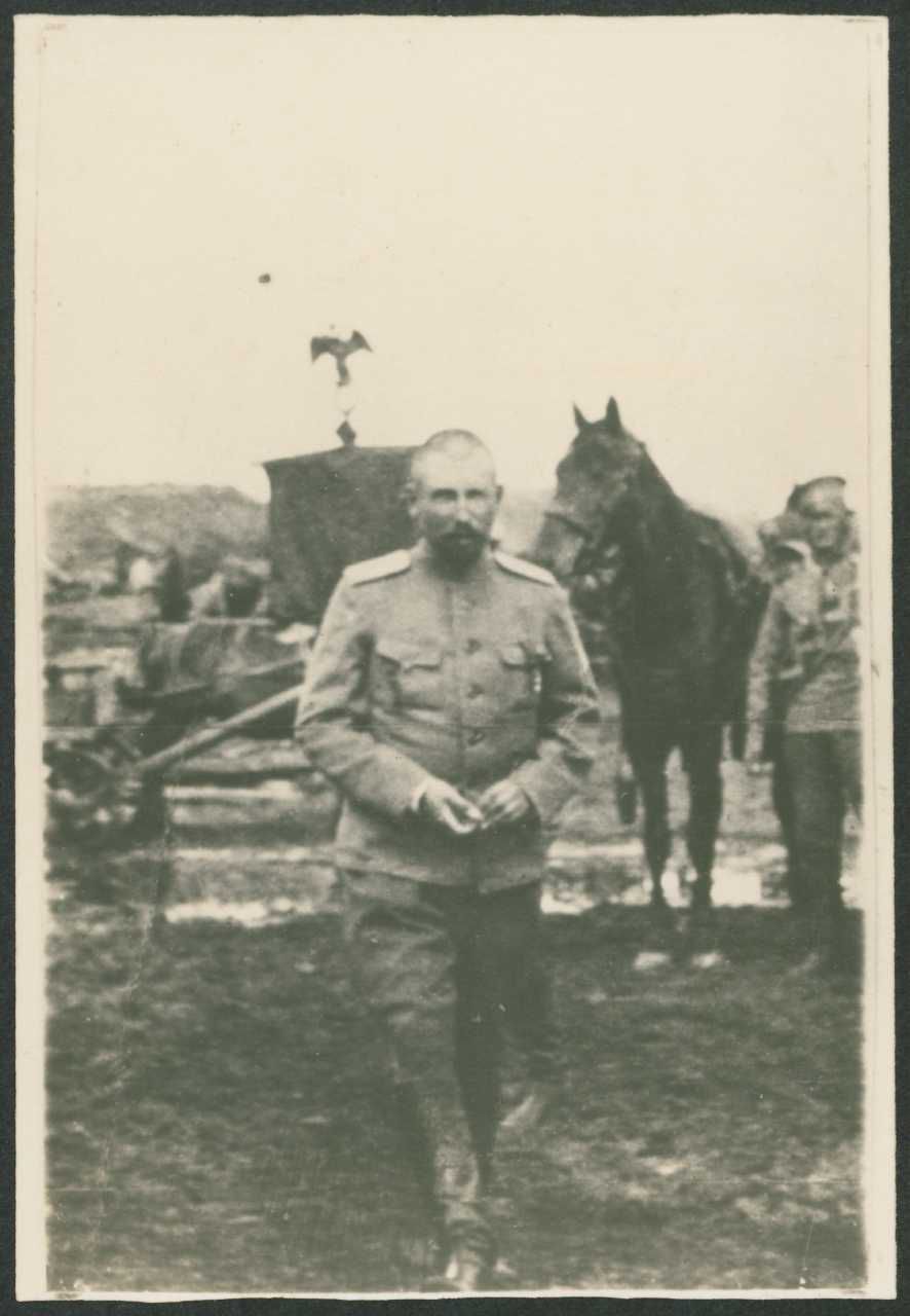 Fotografi af officer i felten. Tekst på bagside: "Пантелеев Кирасир" - "Pantelejev, kyrasser". Fra Gudim-Levkovitj' Samling.