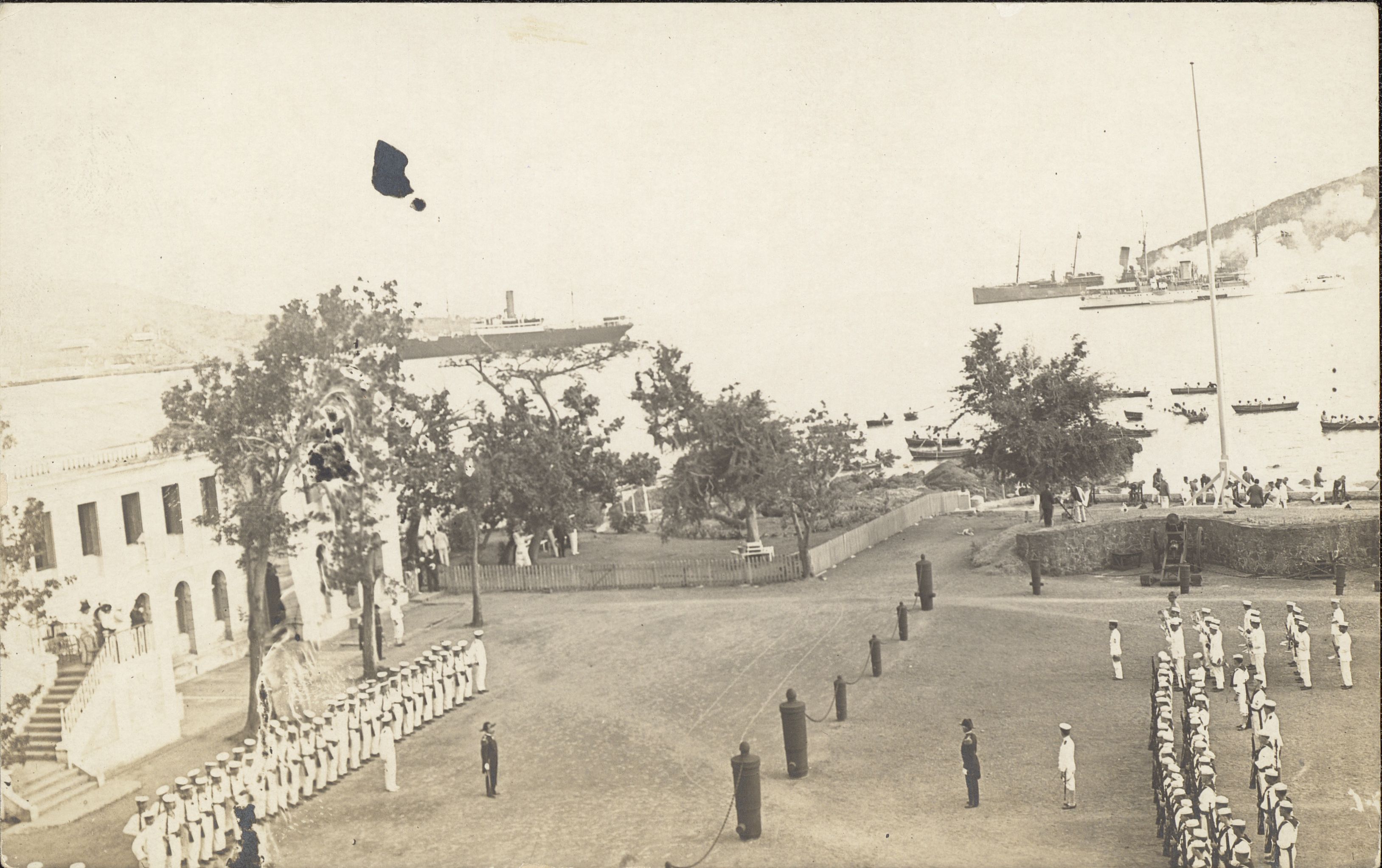 Foto i postkortformat visende udsigten over havnepladsen, Charlotte Amalie, med det danske og amerikanske æreskompagni opmarcheret.