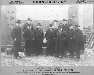 Foto: Søofficerer på studiebesøg hos Schneider og Co. Panser for "Olfert Fischer" d. 15/12 1902.
