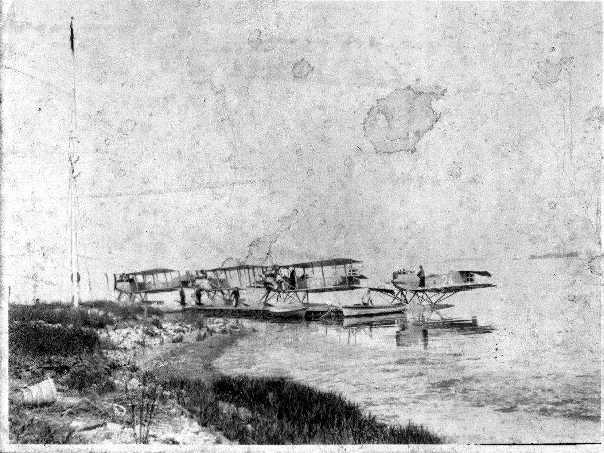 Foto: Stranden ud for flyvebådsstationen med landgangspladsen. Til venstre 3 stk. Freidrichshafen FF 49 - planer. Til højre Hansa-Brandenburg nr. 25.