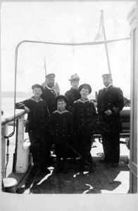 Foto: Gruppebillede: Prins Valdemar, Prinsesse Marie og tre sønner om bord i orlogsskib. Til højre kaptajn V. Jøhnke.