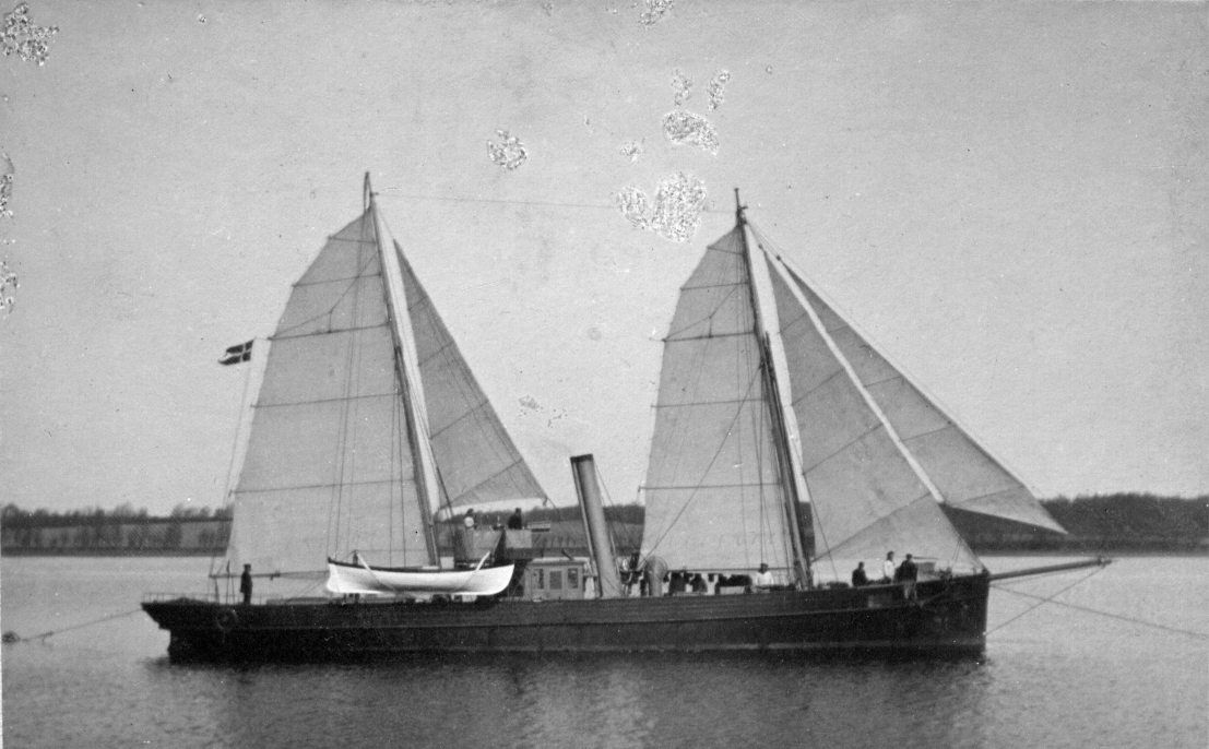 Foto: "Hauch" skruekanonbåd (1862-1900) set mod styrbord med den af ingeniør Vogt konstruerede sejl.