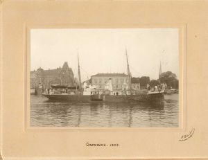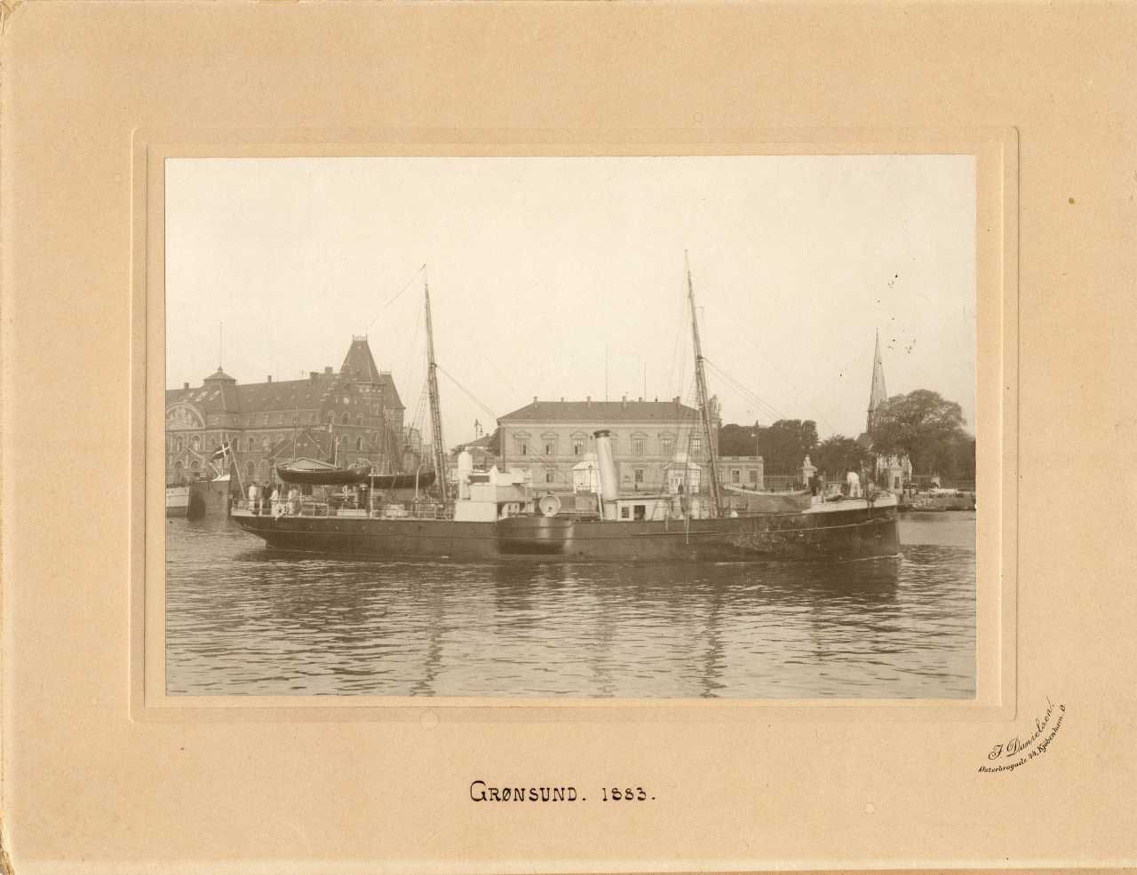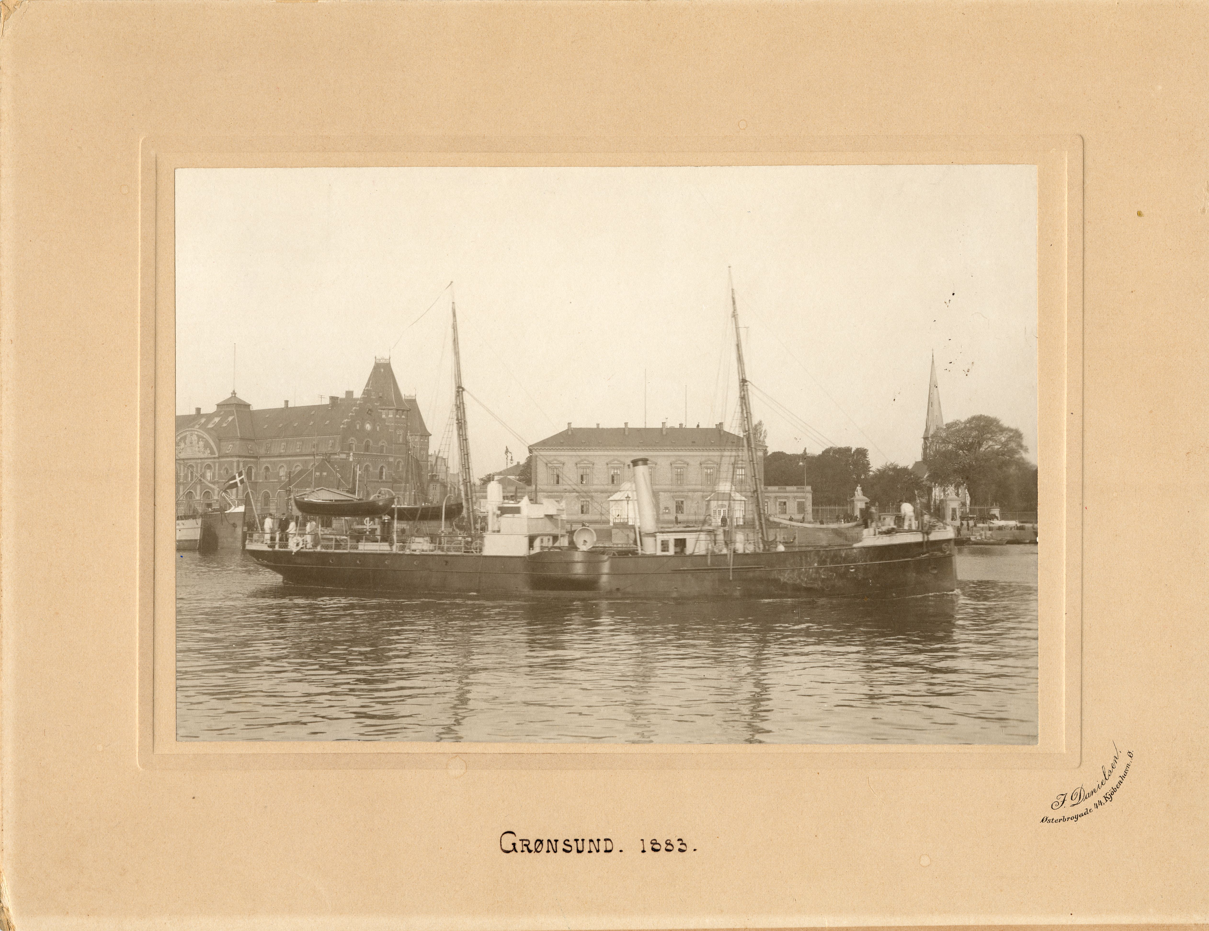 Foto: Kanonbåden "Grønsund" Søat 1883, set sejlende mod styrbord ud for Toldboden. Sortmalet skrog, lyse overbygninger, sortmalede fartøjer. Foto J. Danielsen. Svagt profileret egetræsramme med kvadratiske hjørnestykker.