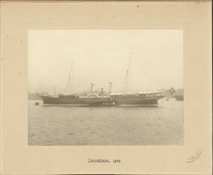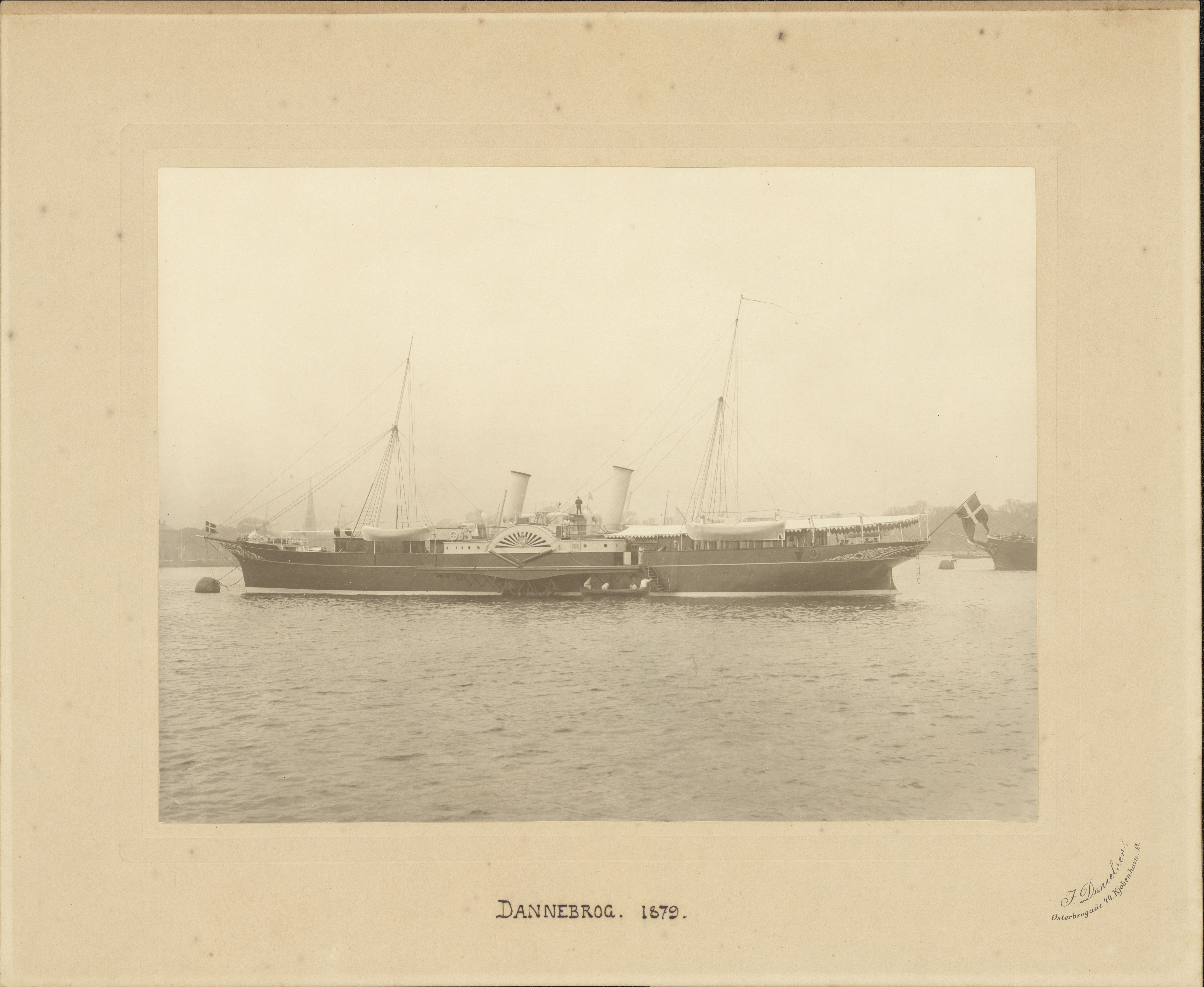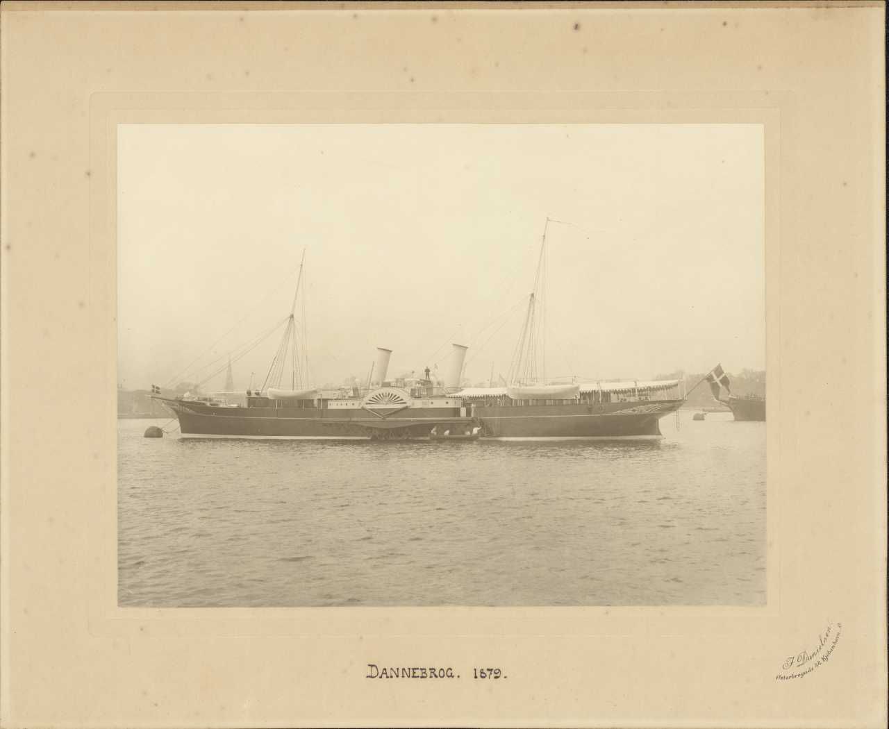 Foto: Kongeskibet "Dannebrog" (1879-1931) set mod bagbord fortøjet ved bøje på Københavns Inderrhed. Ved faldrebet en båd med arbejdende gaster. Solsejl over agterdækket. Ramme af eg svagt profileret med kvadratiske flade hjørner.