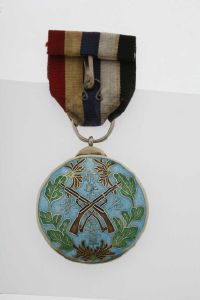 Kinesisk hæderstegn for skydning, hvor der på forsiden af medaljen er indgraveret følgende tekst "Hæderstegn for skydning" samt "General og inspektør over begge Hu-provinserne Chi Lu Yü og af viceinspektør og divisionskommandøren over hærens III division Wu Pei - ru". Båndet til medaljen er sort, hvidt, blåt, gult og rødt, ca. 1910-1920.Tøjhusmuseet, medalje.