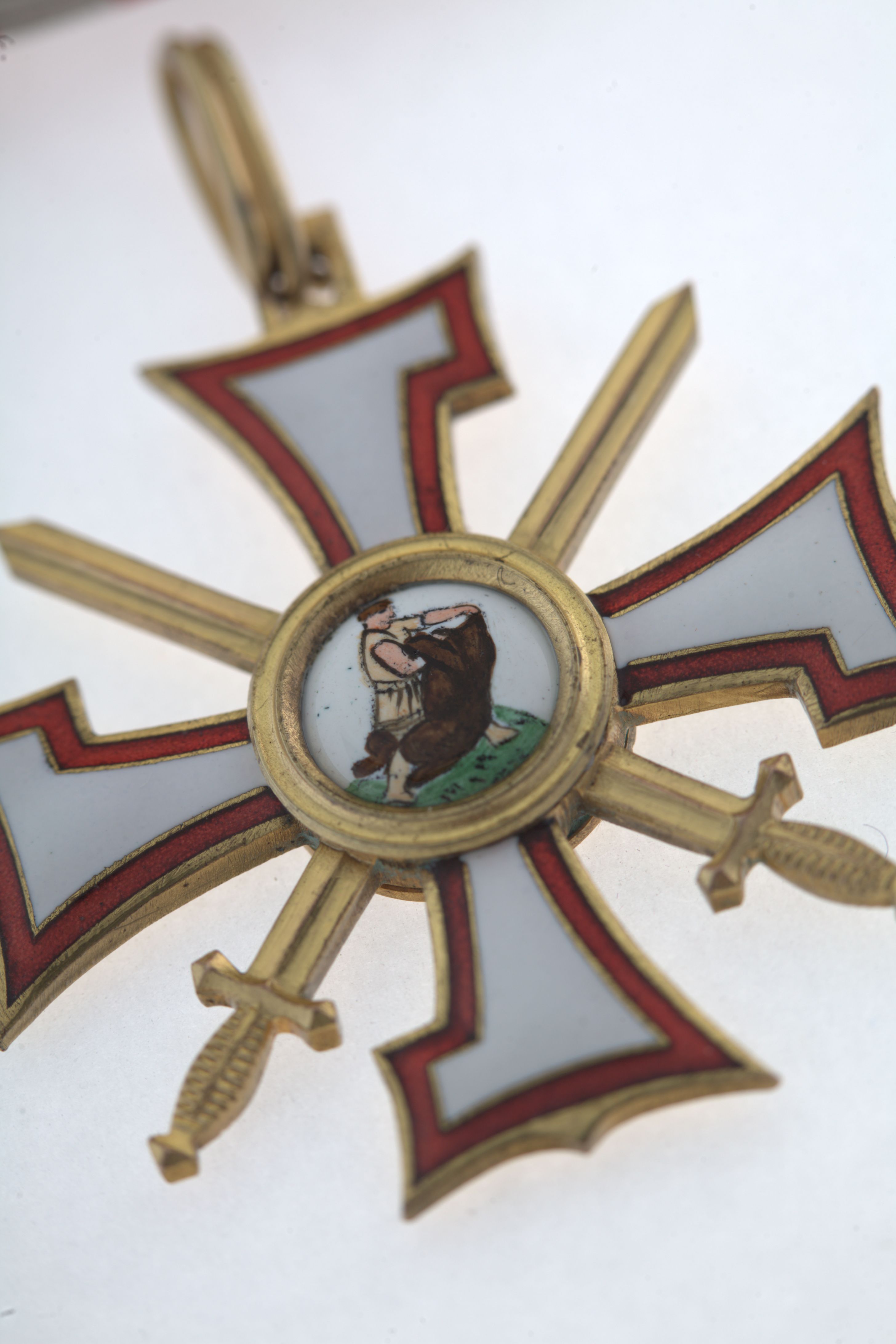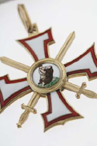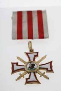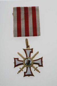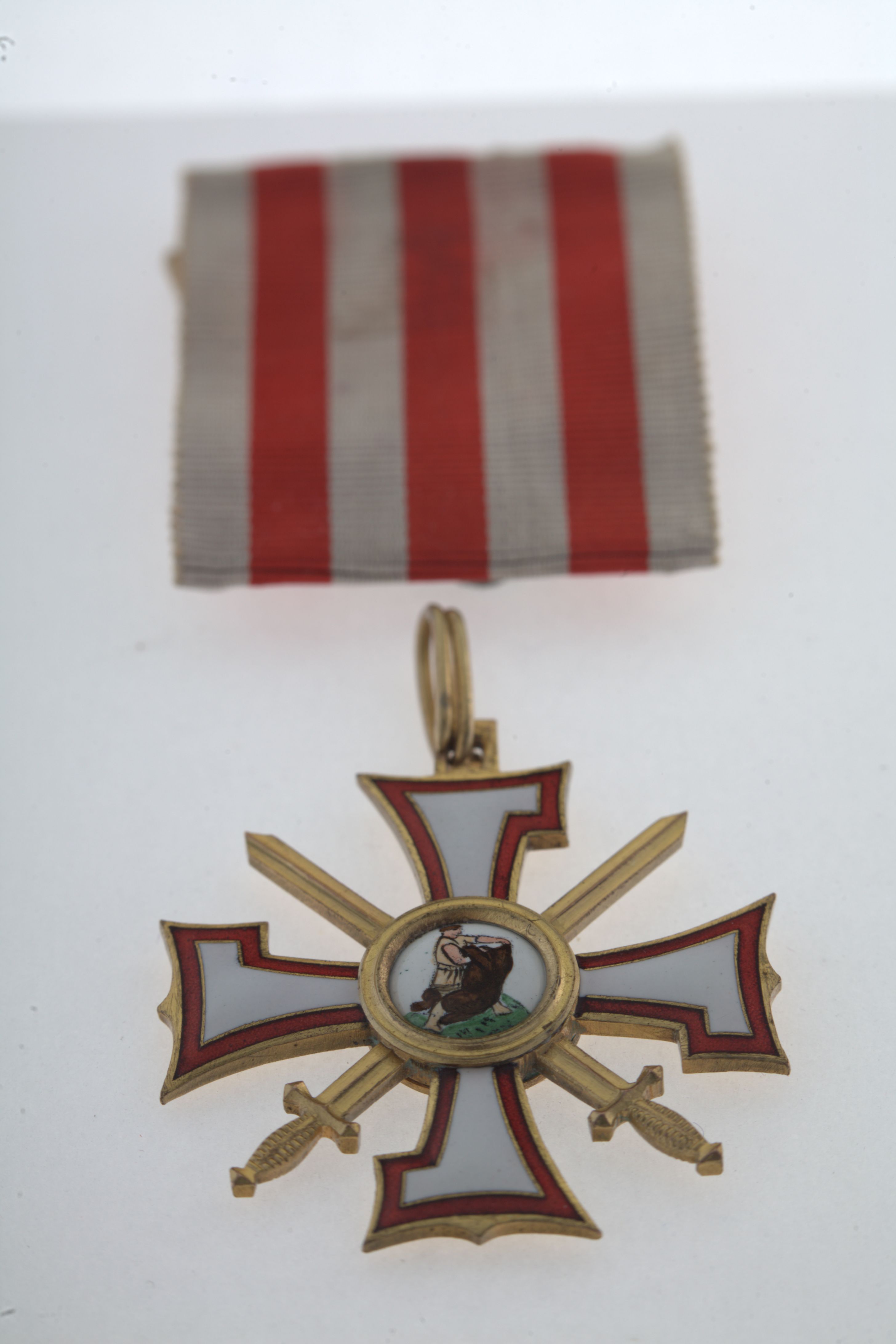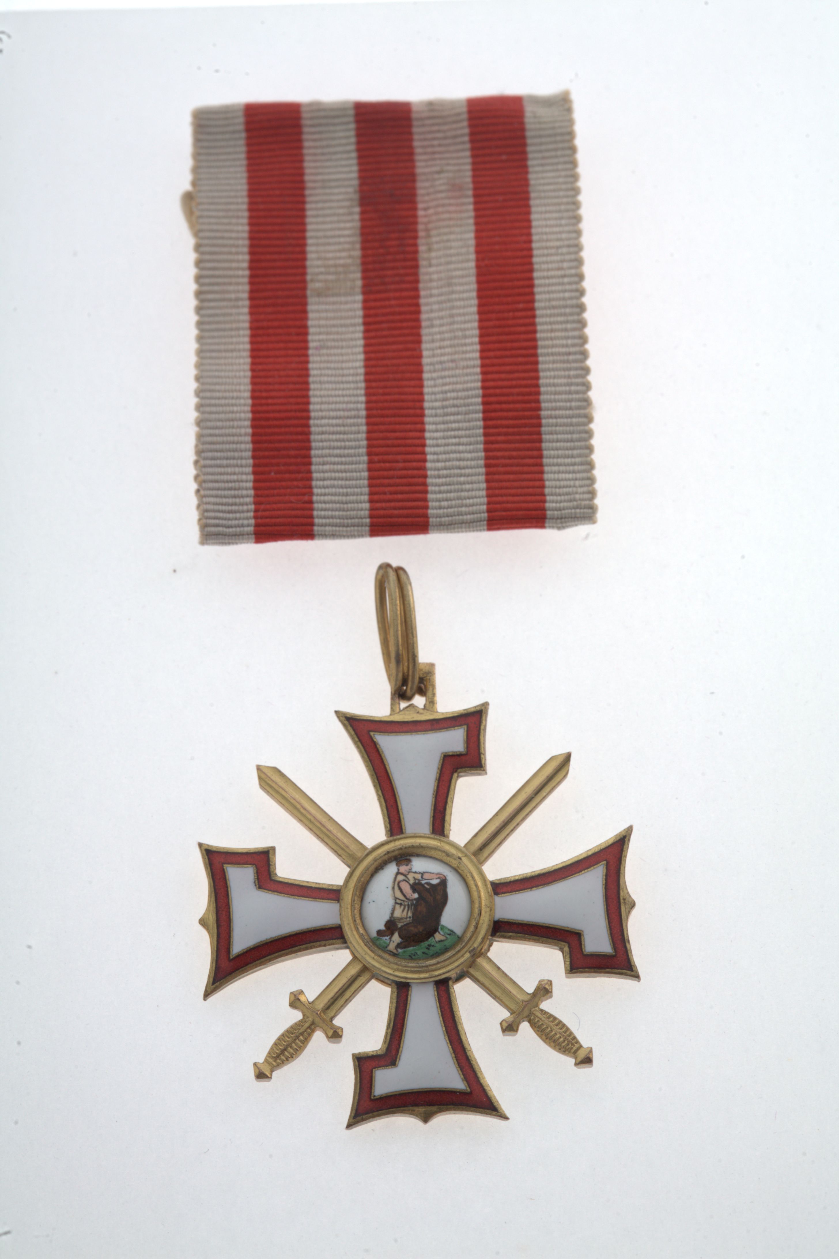 Letlands militære Lacplesis orden (Bjørnedræber ordenen) af tredje klasse, der er stiftet d. 11 nov. 1919 og godkendt d. 18 nov. 1920. Båndet til ordenen er hvidt med tre røde striber.Tøjhusmuseet, medalje.