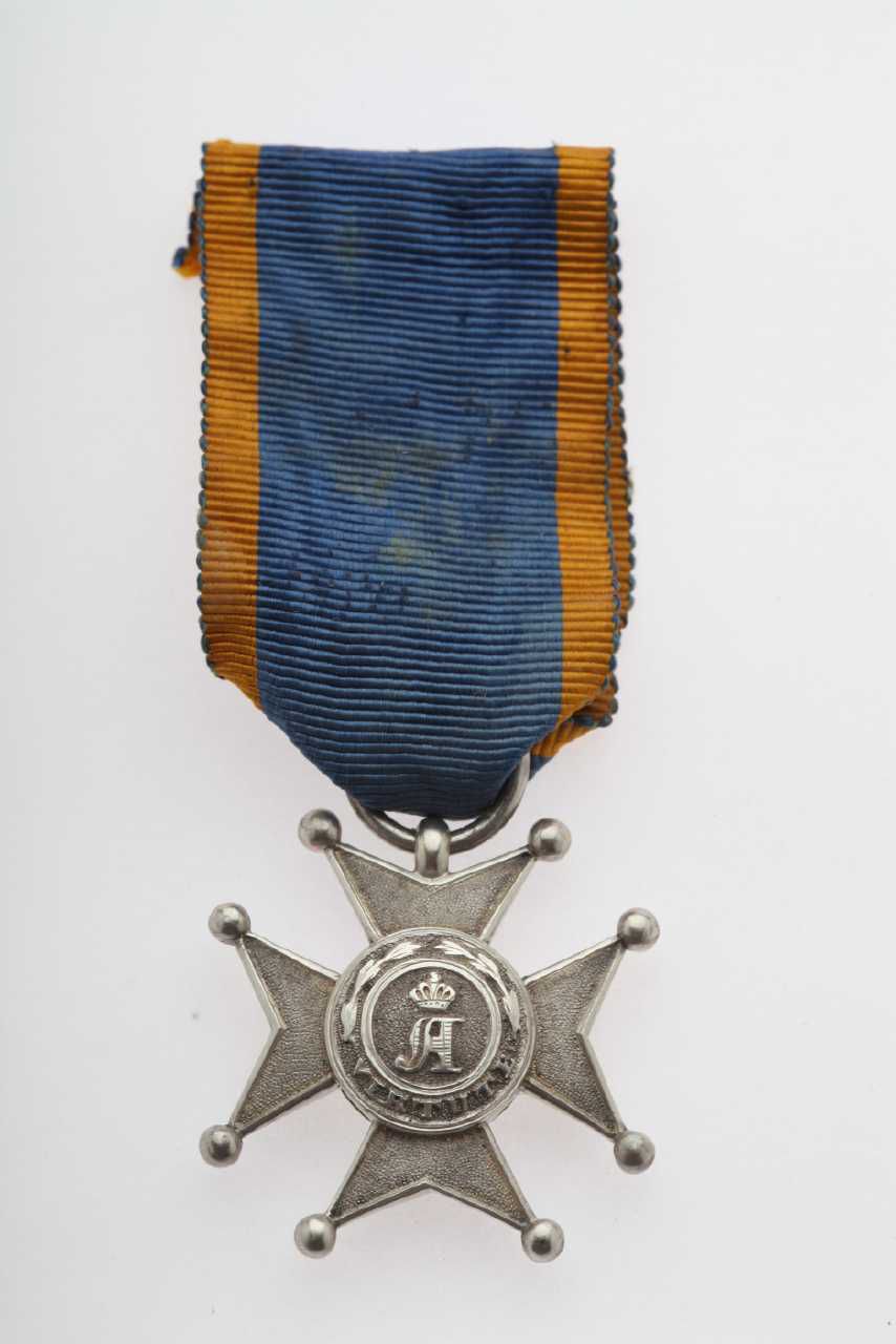 Fortjenstkors fra Nassau (Luxemburg), der er stiftet d. 2/11 1860 og som er uddelt til 1940. På forsiden er der under en krone indgraveret et "A" samt "Virtute". På bagsiden er der indgraveret følgende "1292 1860". Båndet til korset er blåt med gule randstriber.Tøjhusmuseet, medalje.
