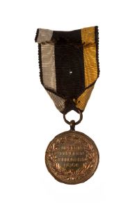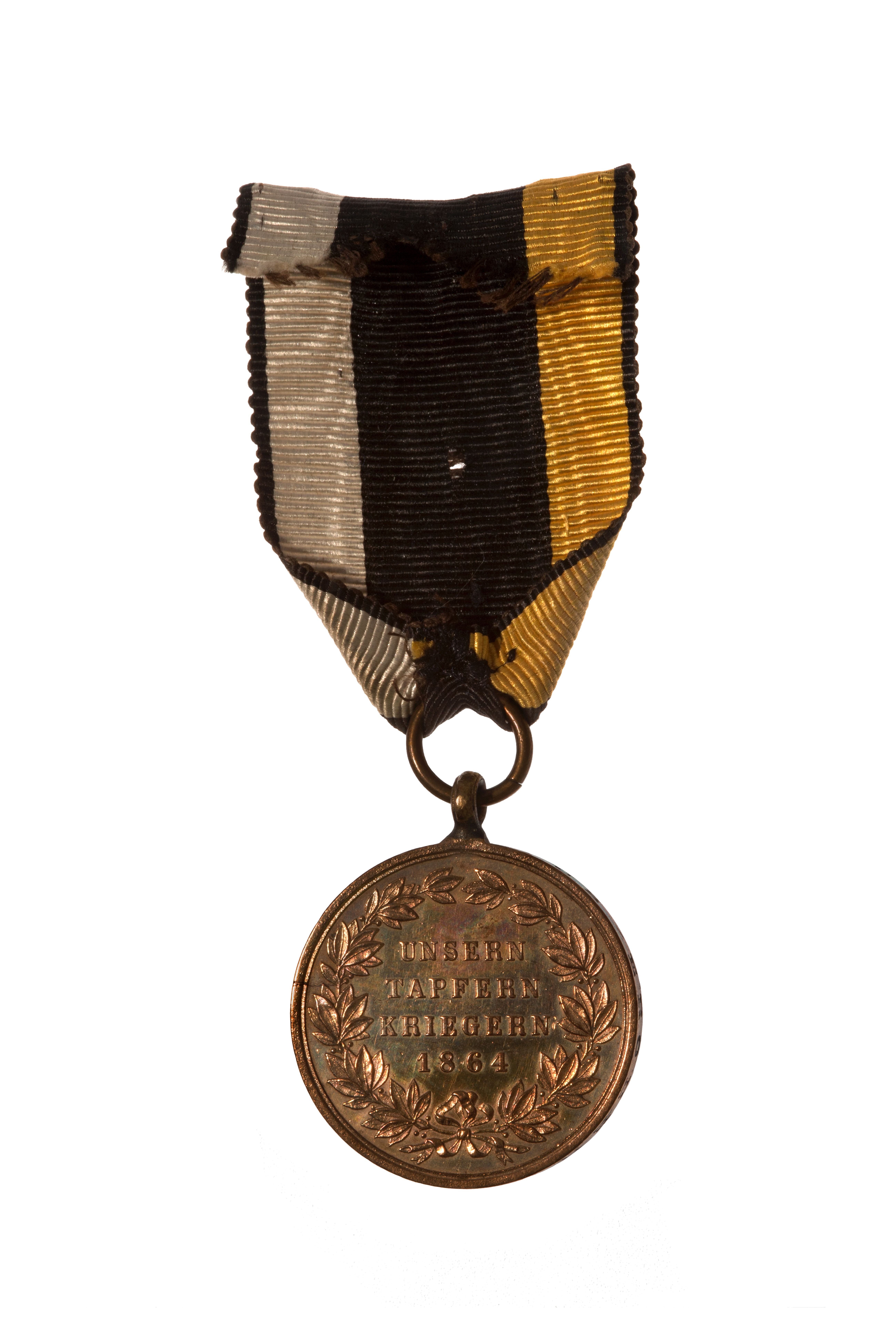 Preussisk krigserindringsmedalje for kombattanter fra den anden slesvigske krig i 1864, der er stiftet d. 10/11 1864 og uddelt samme år. Medaljen er givet for at have erobret de danske kanoner. På forsiden ses følgende påskrift "W" under en kongekrone og "FJ" under kejserkronen. På bagsiden ses følgende påskrift "Unsern tapfren kriegern 1864". Båndet til medaljen er sort med en gul og en hvid stribe. Tøjhusmuseet, medalje.