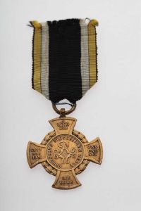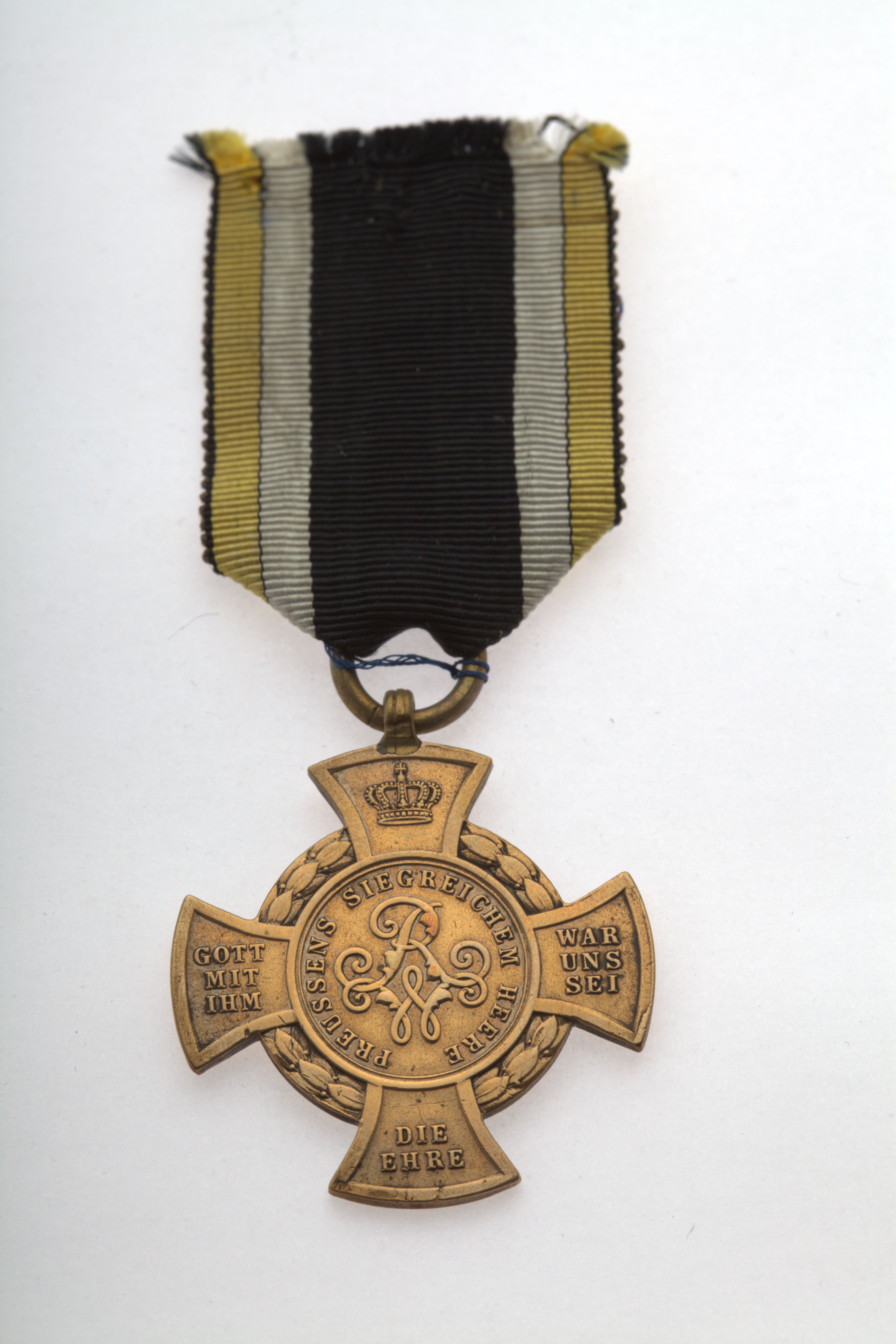 Preussisk erindringskors for deltagelse i den preussisk-østrigske krig i 1866, der er stiftet d. 20/9 1866 og uddelt samme år. På forsiden ses følgende påskrift "WR" samt "Gott war mit uns ihm sei die ehre". På bagsiden ses en ørn samt indskriften "Der main armee 1866". Båndet til korset er sort. Ved hver side ses en gul og en hvid stribe, adskilt ved en sort streg.Tøjhusmuseet, medalje.