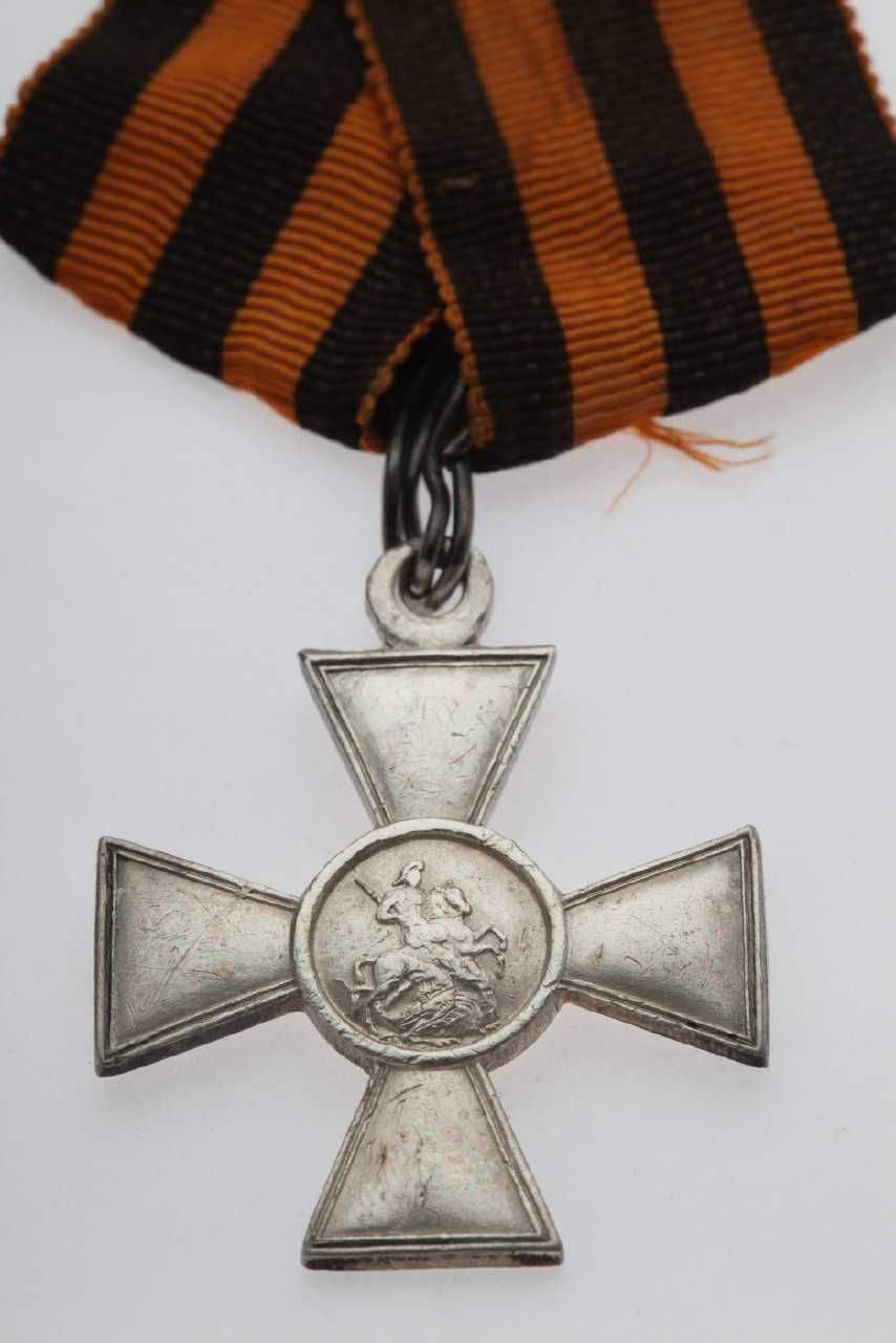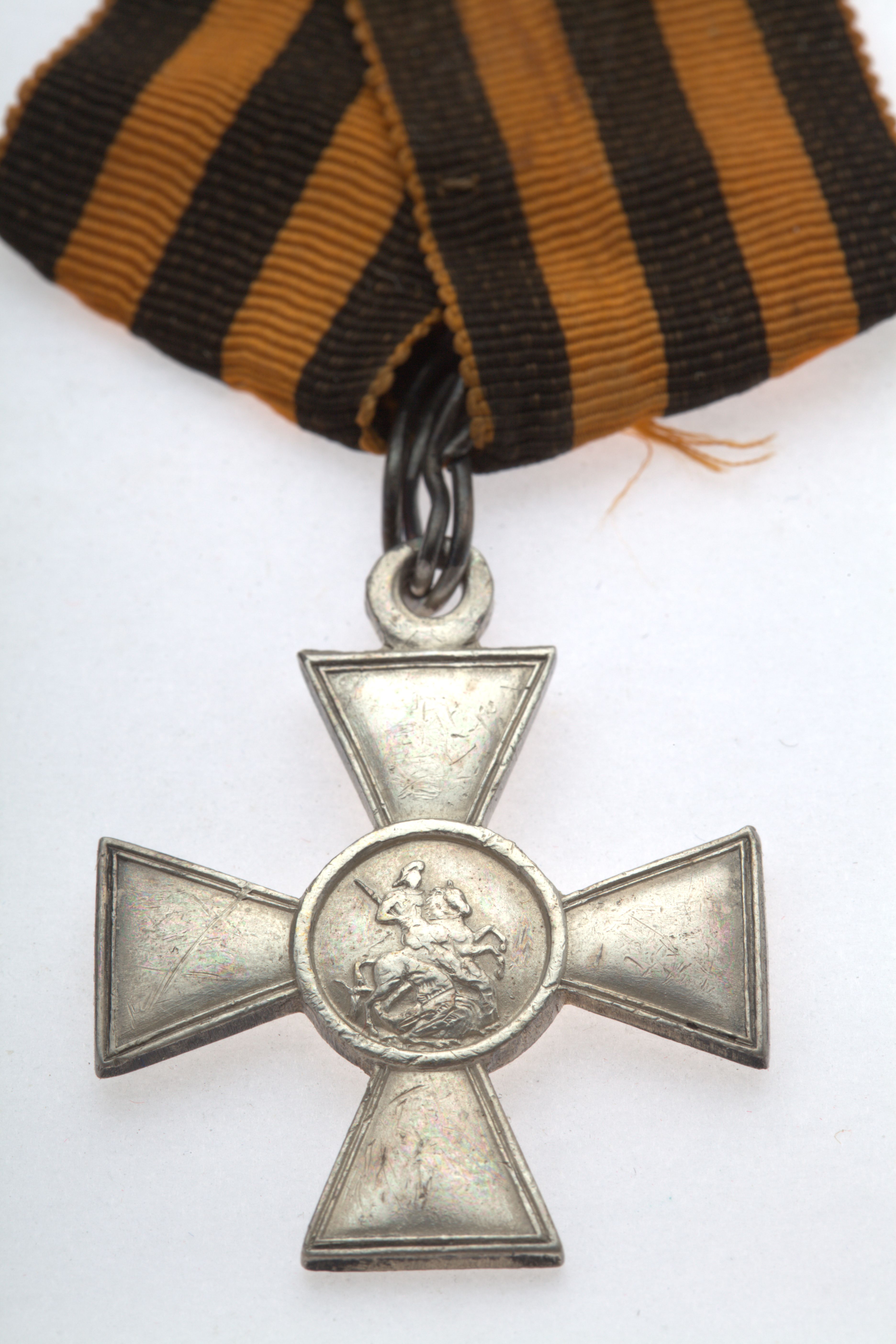 Russisk St. Georgs kors af IV klasse for menige, hvor nummeret på korset er 6940. Båndet til korset er orange med sorte striber. Korset er en gave fra General S. Pototskij. Amager Boulevard 120. Tøjhusmuseet, medalje.