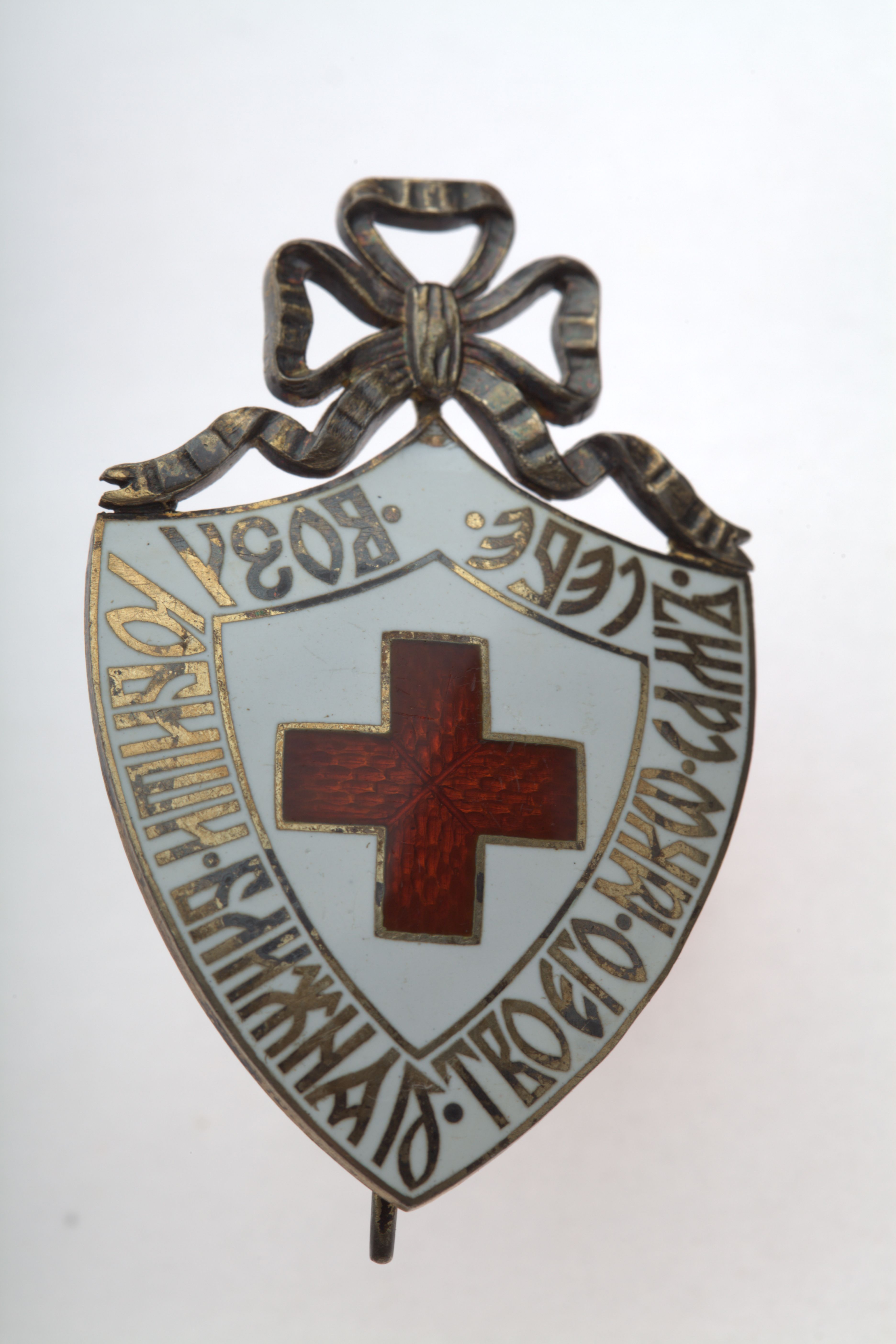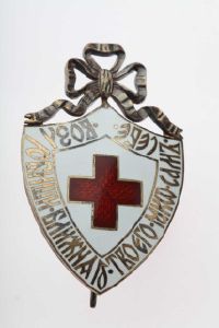 Russisk udmærkelsestegn for Røde Kors, hvor der på forsiden ses der følgende påskrift "Du skal elske din næste som dig selv", mens der på bagsiden ses en lodret nål. Der findes ingen bånd til tegnet. Tegnet er givet til museet af General Gudim-Levkovitj.Tøjhusmuseet, medalje.