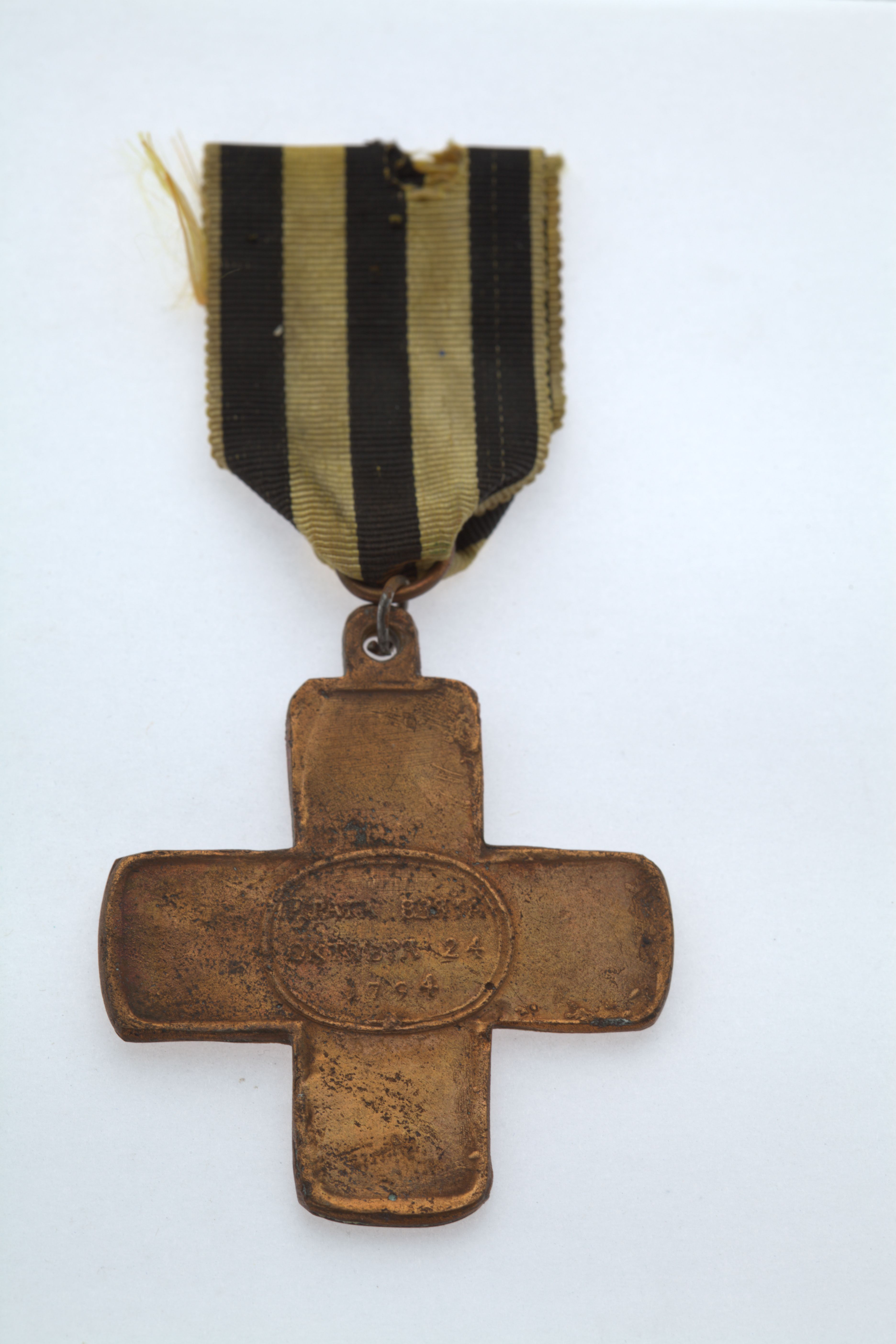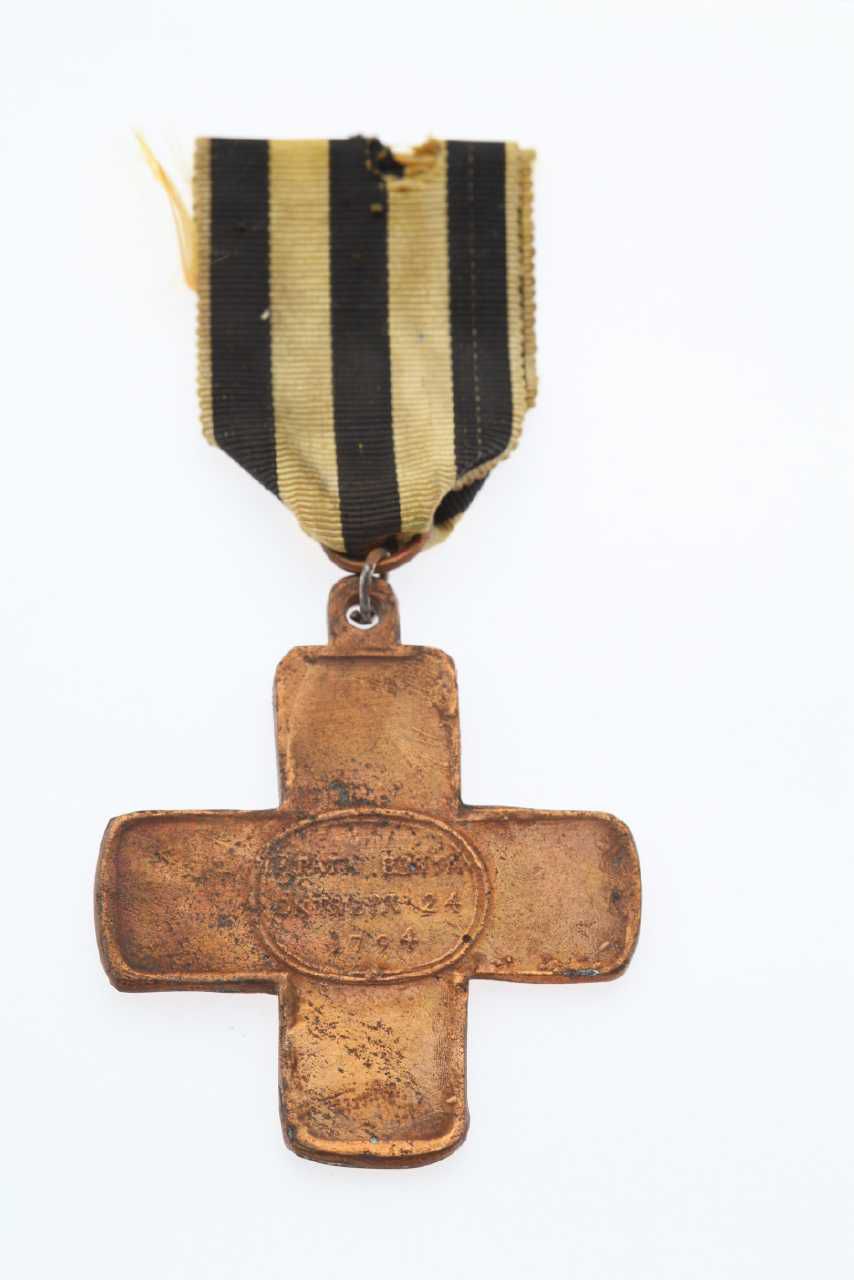 Den russiske St. Georgsorden der er stiftet d. 1/1 1795, som er givet til officerer, der har deltaget i inddragelsen af forsvarsfæstningen Praga ved Warszawa d. 24/10 1794. Korset gives i guld til officerer, mens dette konkrete kors er tildelt soldater, der fik korset i sølv for samme indsats. På forsiden af korset ses følgende påskrift "For dåd og tapperhed", mens der på bagsiden ses denne påskrift "Praga slaget - Oktober 24, 1794". Båndet til korset er gult med tre sorte striber. Tøjhusmuseet, medalje.