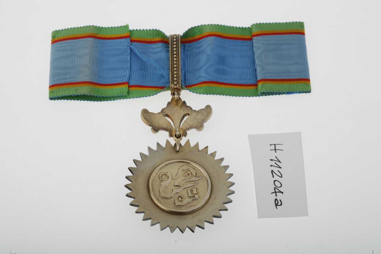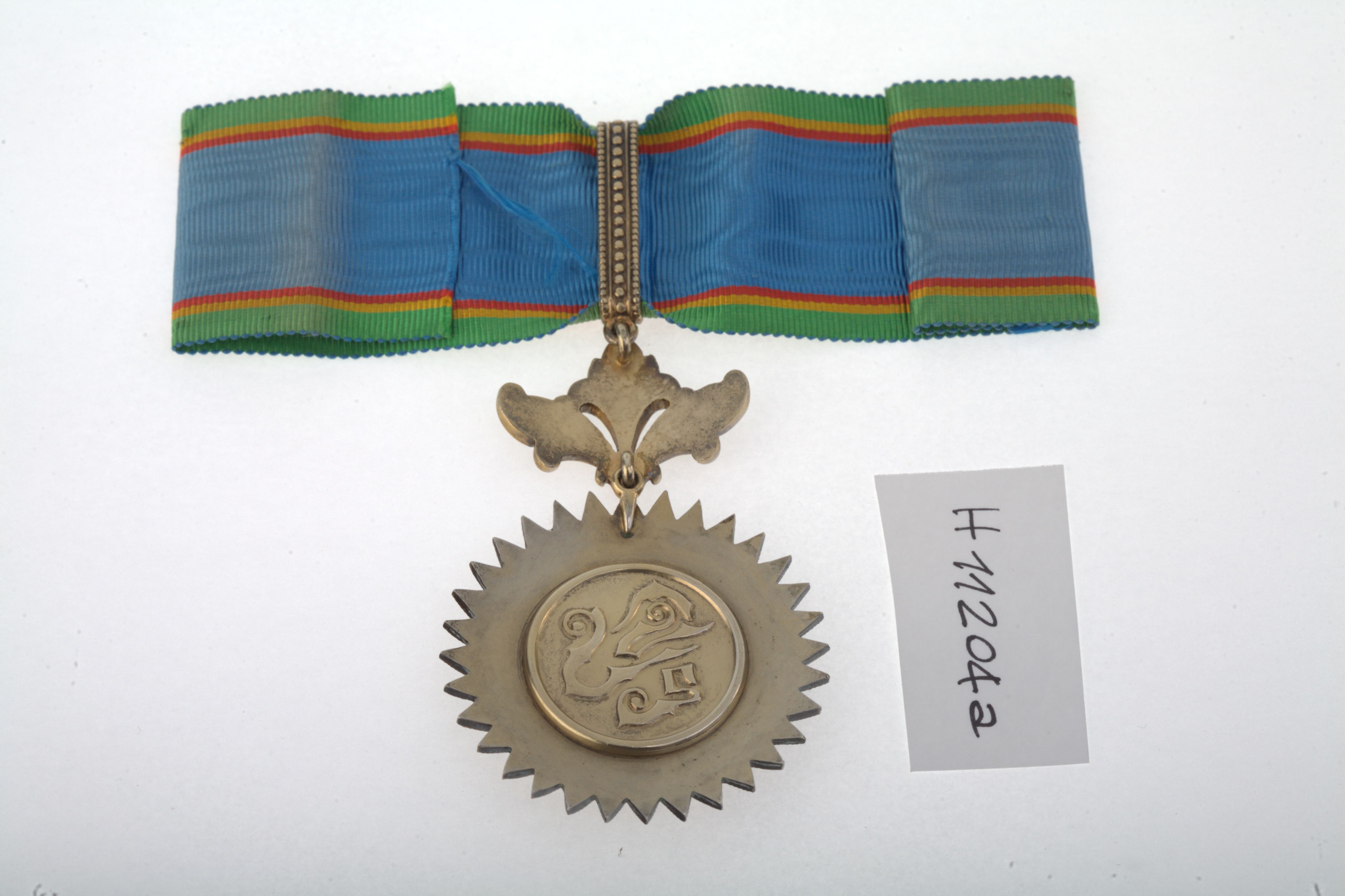 Den siamesiske Krones Orden af tredje klasse, der består af en dekoration (H 11204a) og stjerne (H 11204b). Dekorationen er stiftet d. 29/12 1869. Båndet til dekorationen er blåt med grønne kantstriber adskildt ved en rød og gul streg. Med dekorationen fulgte et langt og et kort bånd. Dekorationen er givet til Oberstløjtnant Greve Kjeld Brockenhuus Schack chef for 12. batl. Tøjhusmuseet, medalje.