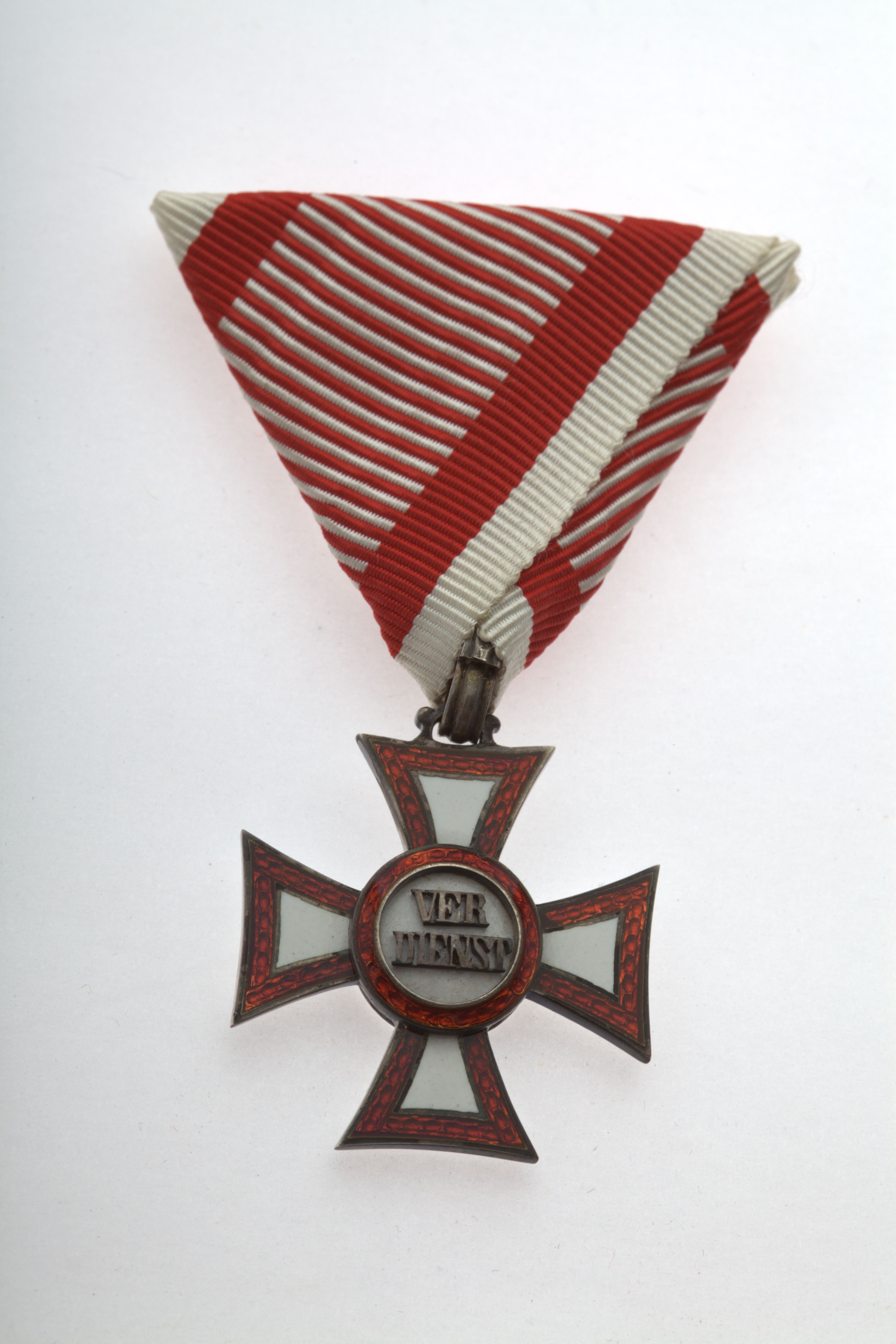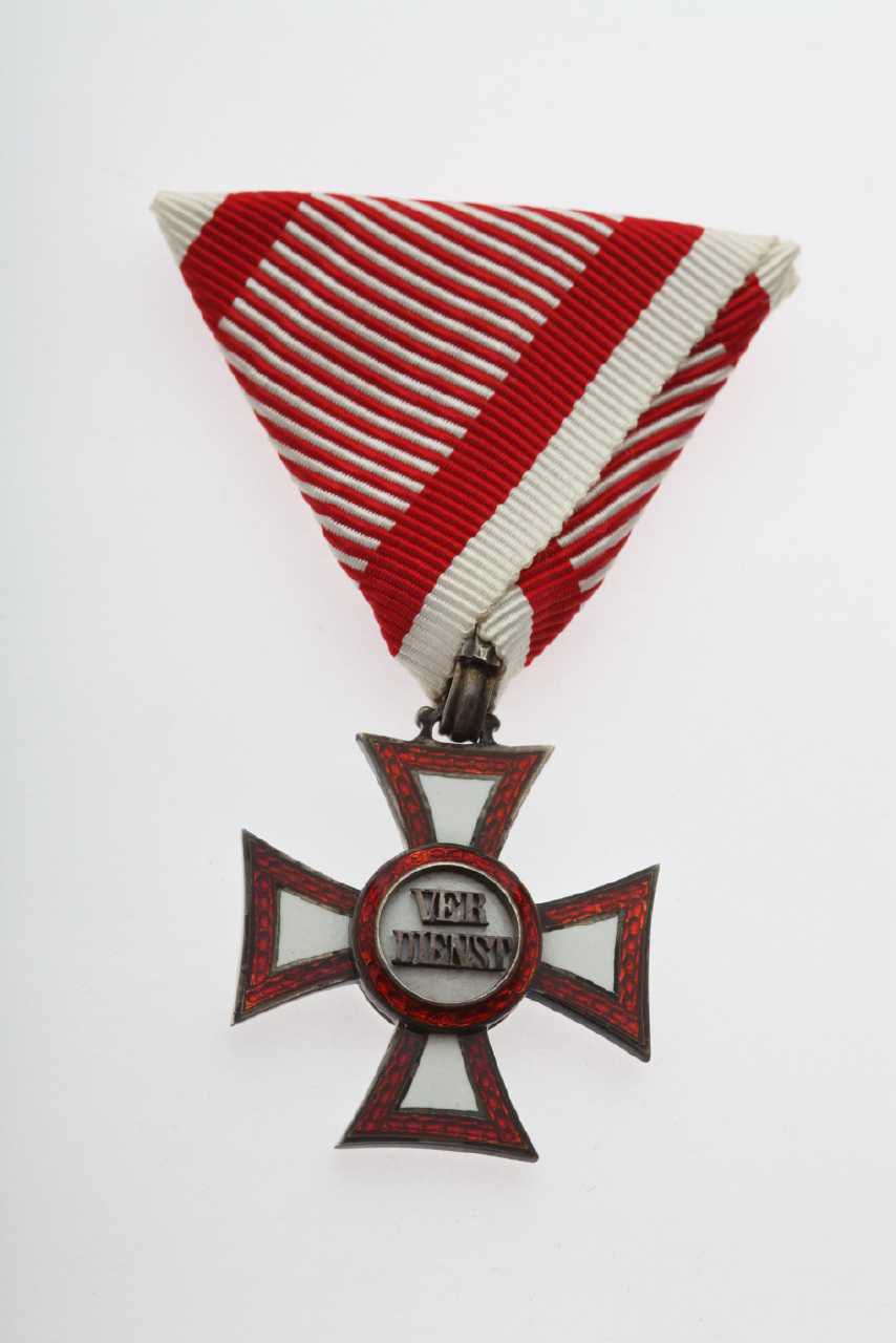 Militært fortjenstkors af tredje klasse fra Østrig-Ungarn, der er stiftet d. 22/10 1849. Korset er i denne form uddelt fra 1860 til 1918. På forsiden af korset ses følgende indskrift "Verdienst". Båndet til korset er sandsynligvis rødt med hvide kanter og hvide tværribber. Tøjhusmuseet, medalje.