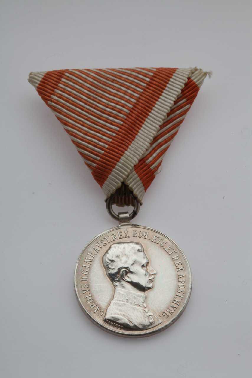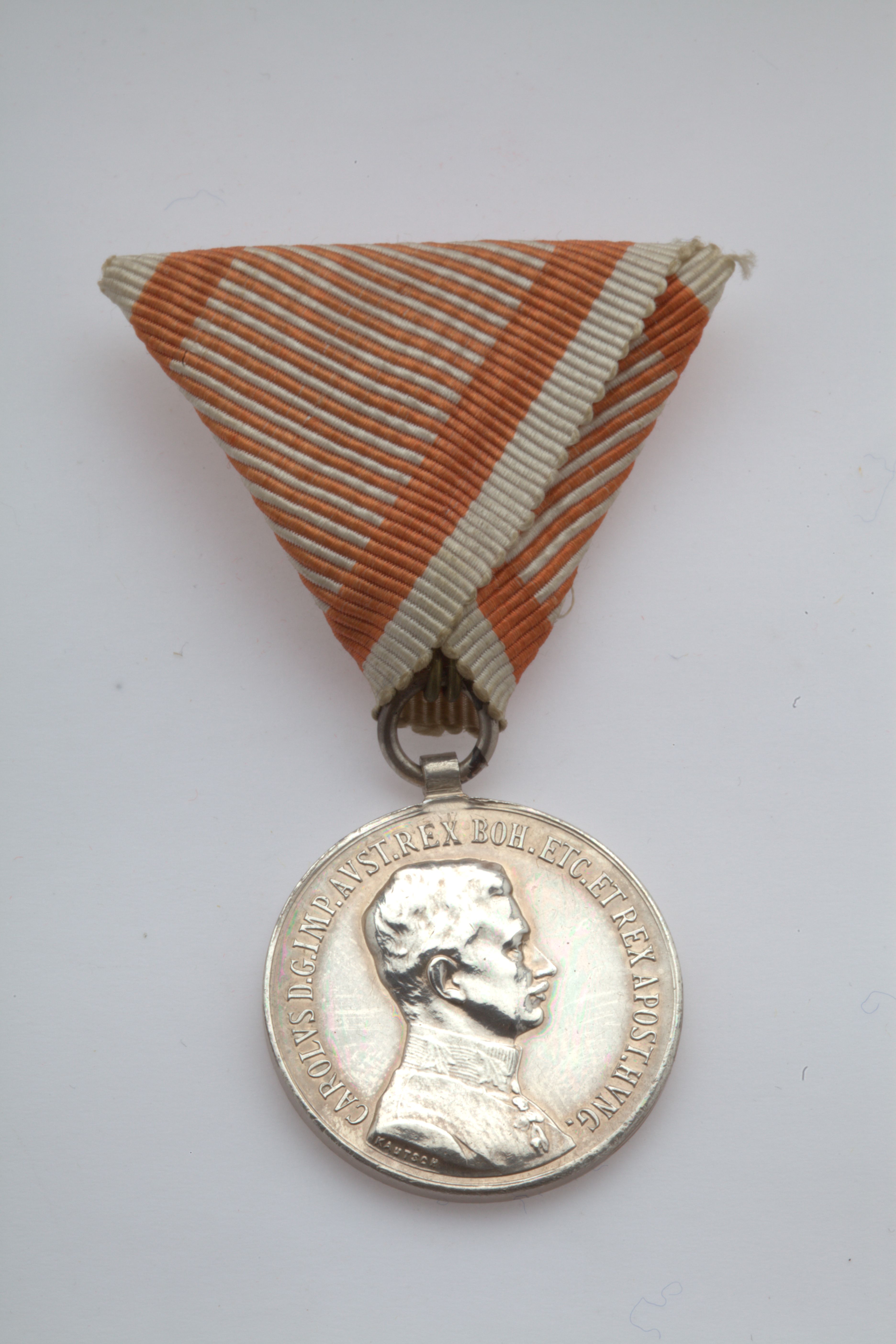 Østrig-Ungarsk tapperhedsmedalje af anden klasse med Kejser Karls billede, der er stiftet d. 19/7 1789 og fornyet d. 4/4 1917 og uddelt til 1918. På forsiden af medaljen ses følgende påskrift "Carolus D. G. Imp. Avst. Rex. Boh. Ect. Et. Rex. Apost. Hvng.". På bagsiden ses følgende indskrift "Fortitudini". Båndet til medaljen er rødt med hivde kanter og hvide tværribber. Tøjhusmuseet, medalje.