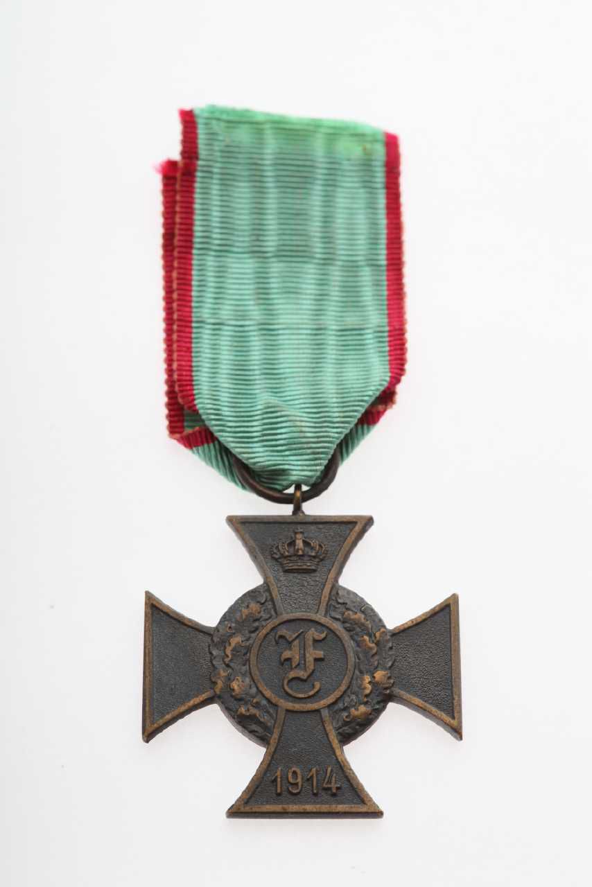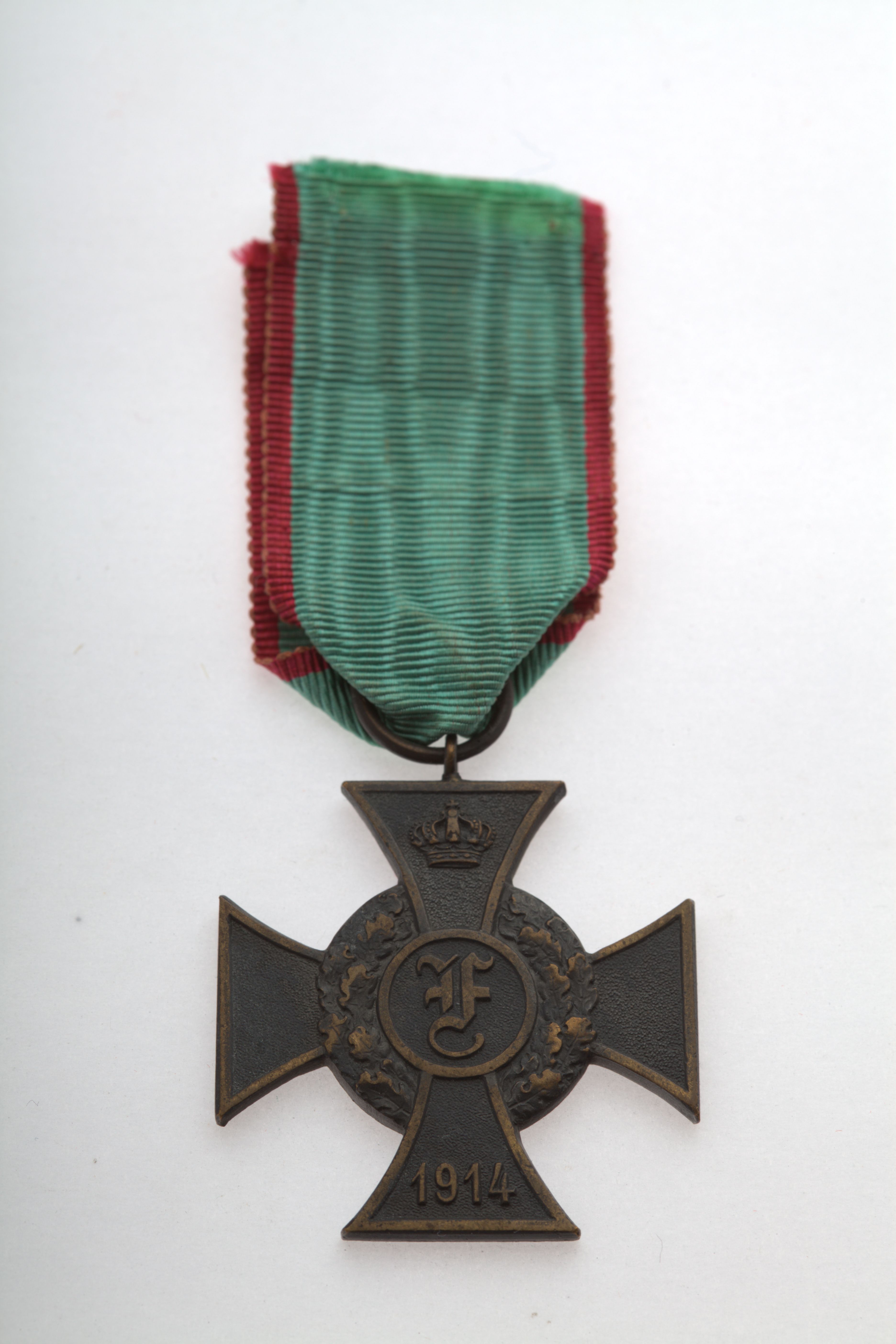 Anhalt, Friedrich-kors, tildelt for militær deltagelse i 1. Verdenskrig. Friedrich-korset er stiftet d. 12/12-1914 og uddelt fra 1914-1918. Båndet er grønt med røde kanter.Tøjhusmuseet, medalje.