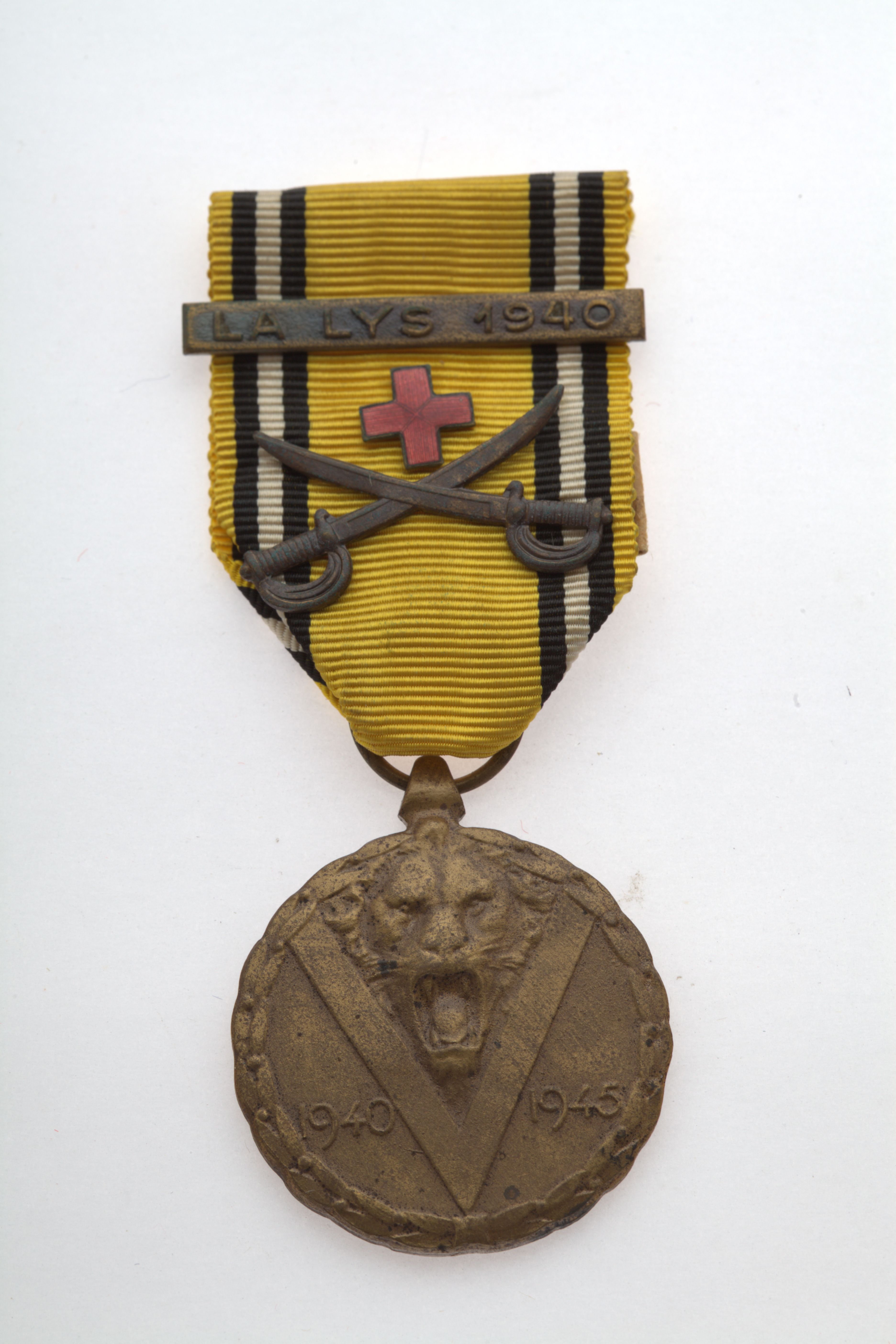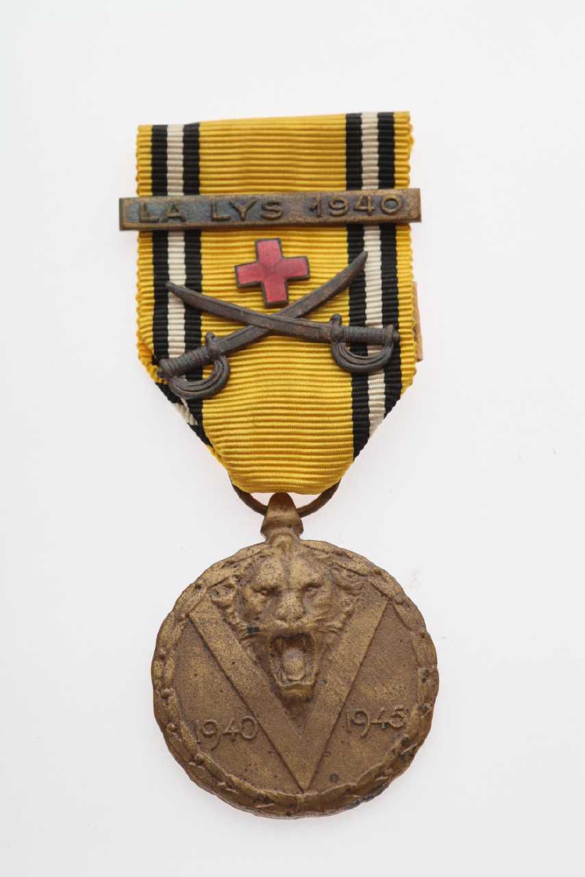 Belgisk erindringsmedalje for krigen 1940-1945, et brølende løvehoved omkranset af et stort V, omgivet af årstallene 1940 og 1945. Båndet er gult med sortbred stribe nær kanten. På båndet forskellige tegn: et spænde med tekst "La Lys 1940" og et rødt emaljekors og to krydsede sabler som er et tegn for en kæmpende afdeling.