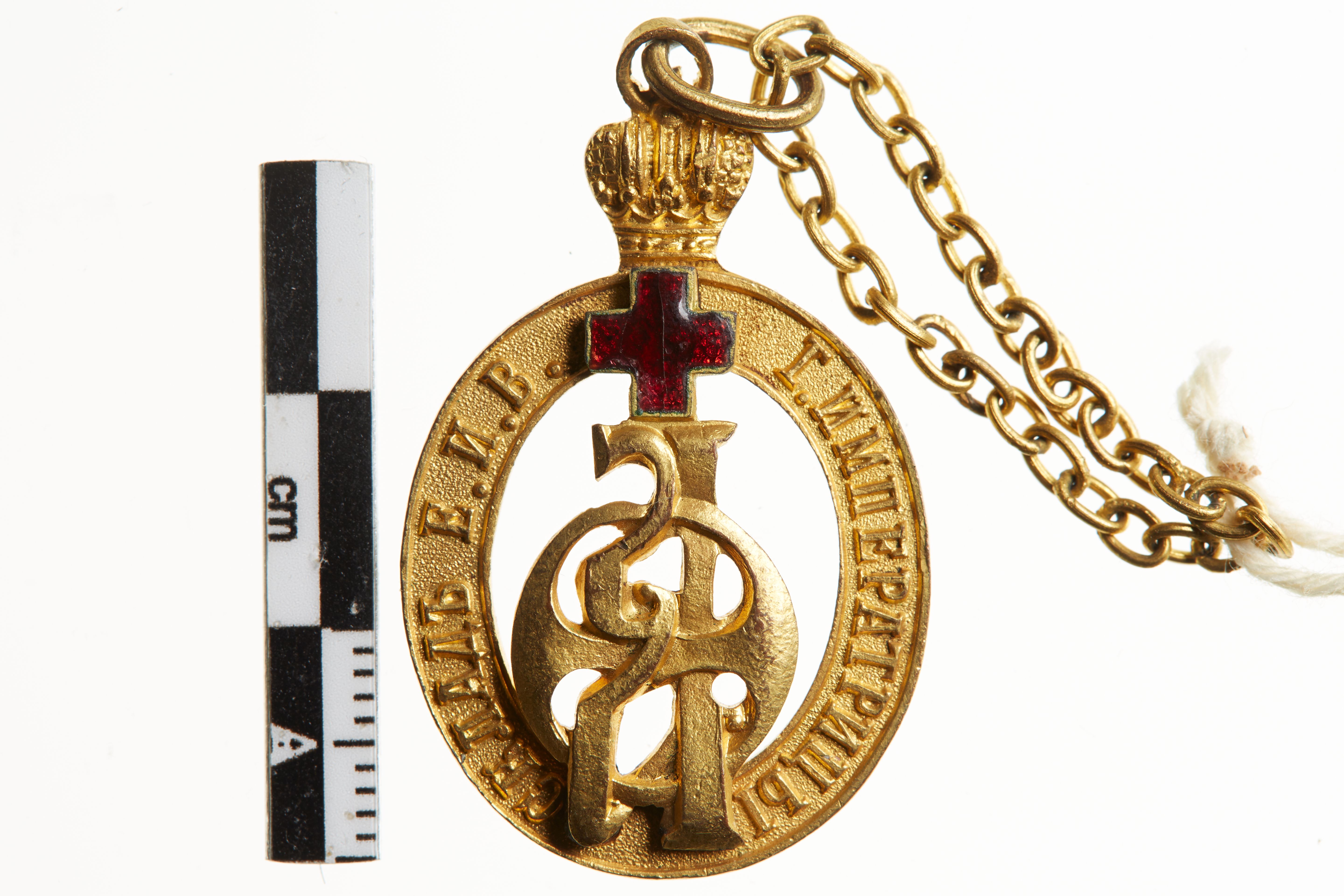 Ovalt mindetegn for Røde Kors-arbejde med kejserlig krone og ring med kæde øverst. Under kronen et emaljeret rødt kors, derunder kejserinde Alexandra Fjodorovnas monogram i gennem brudt arbejde.