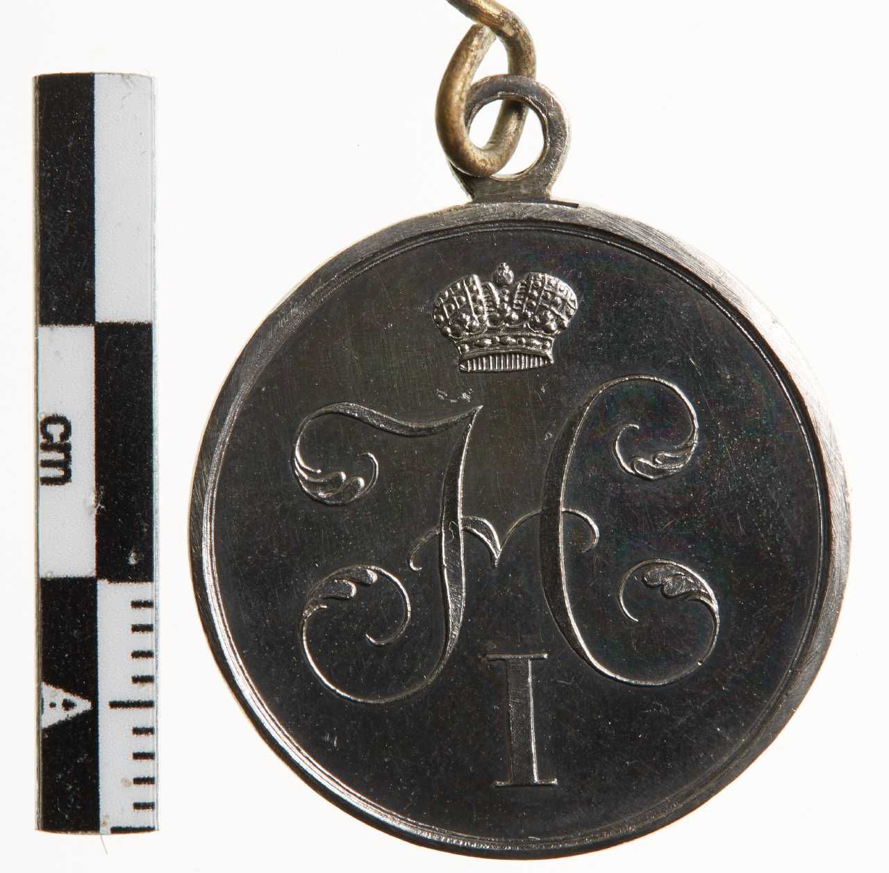 Russisk felttogsmedalje for hjælpekorpset til Egypten i 1833. På forsiden Nikolaj 1.s Monogram, på bagsiden årstallet 1833.