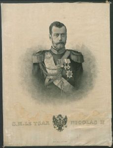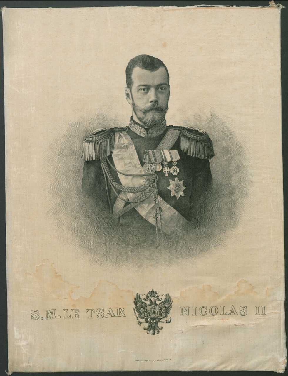 Portræt trykt på silke forstillende Kejser Nikolaj 2. Under portrættet det kejserlige våben og fransk tekst: S.M. Le Tsar Nicolas II.