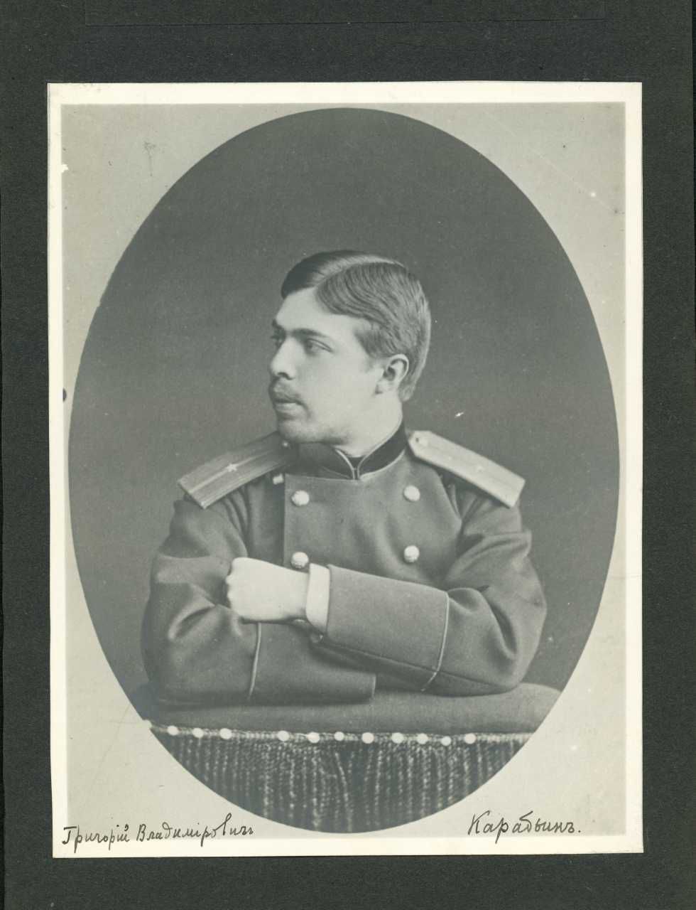 Fotografisk portræt af underløjtnant (praporshik) ved Hestgarde-Artilleriregimentet (Прапорщик по Армейской Артиллерии), Grigorij Vladimirovitj Kabardin - Григорий Владимирович Карабьин.