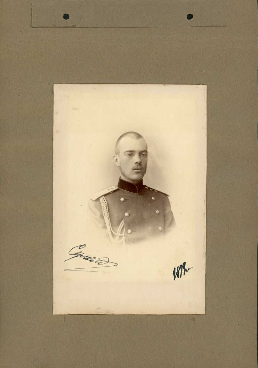 Fotografisk portræt af storfyrste Sergej Mikhailovitj - Великий Князь Сергей Михайлович (1869-1918), i Hestgarde-artilleriets uniform, 1892.