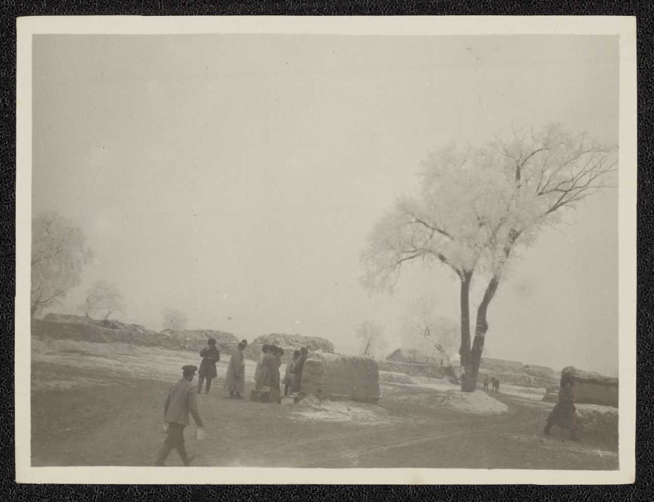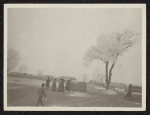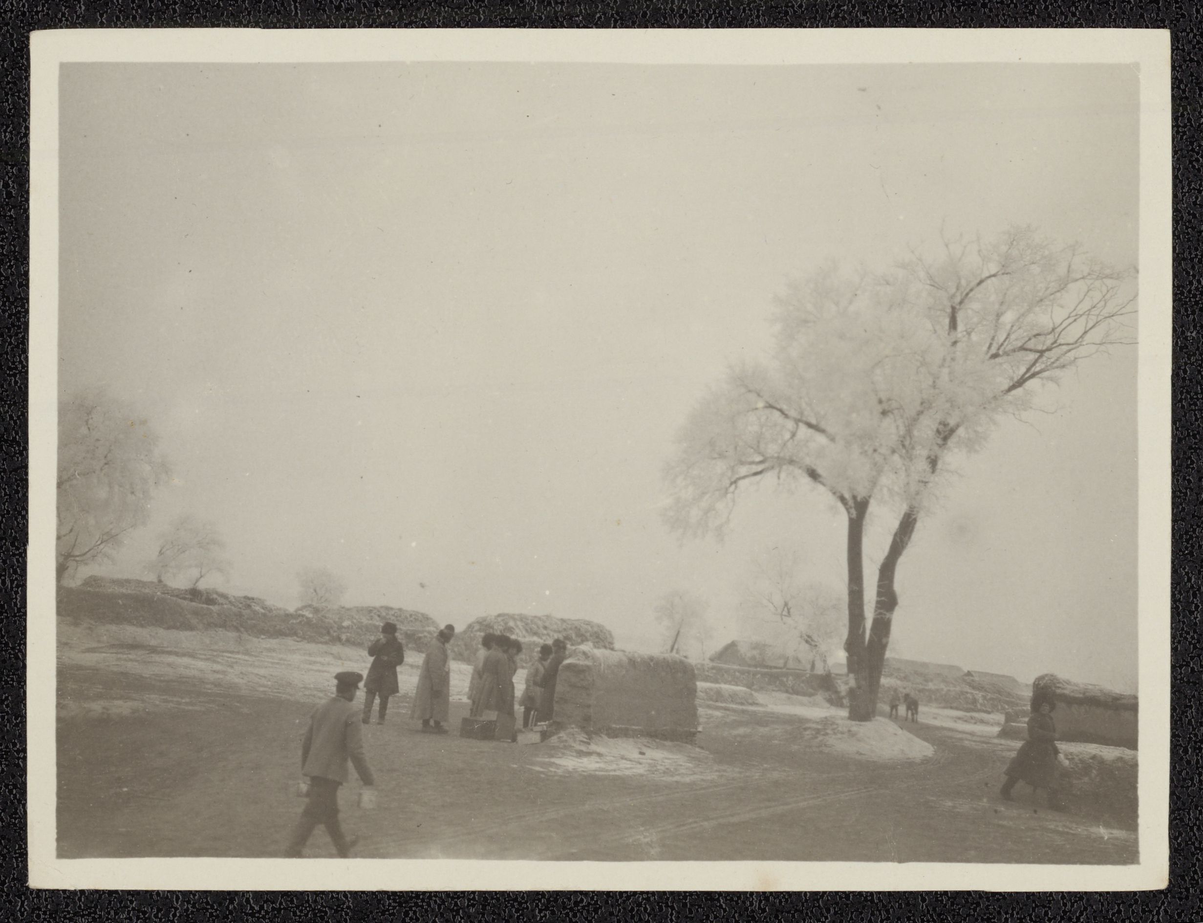 Fotografi af soldater i en landsby, frost på jorden og træerne.