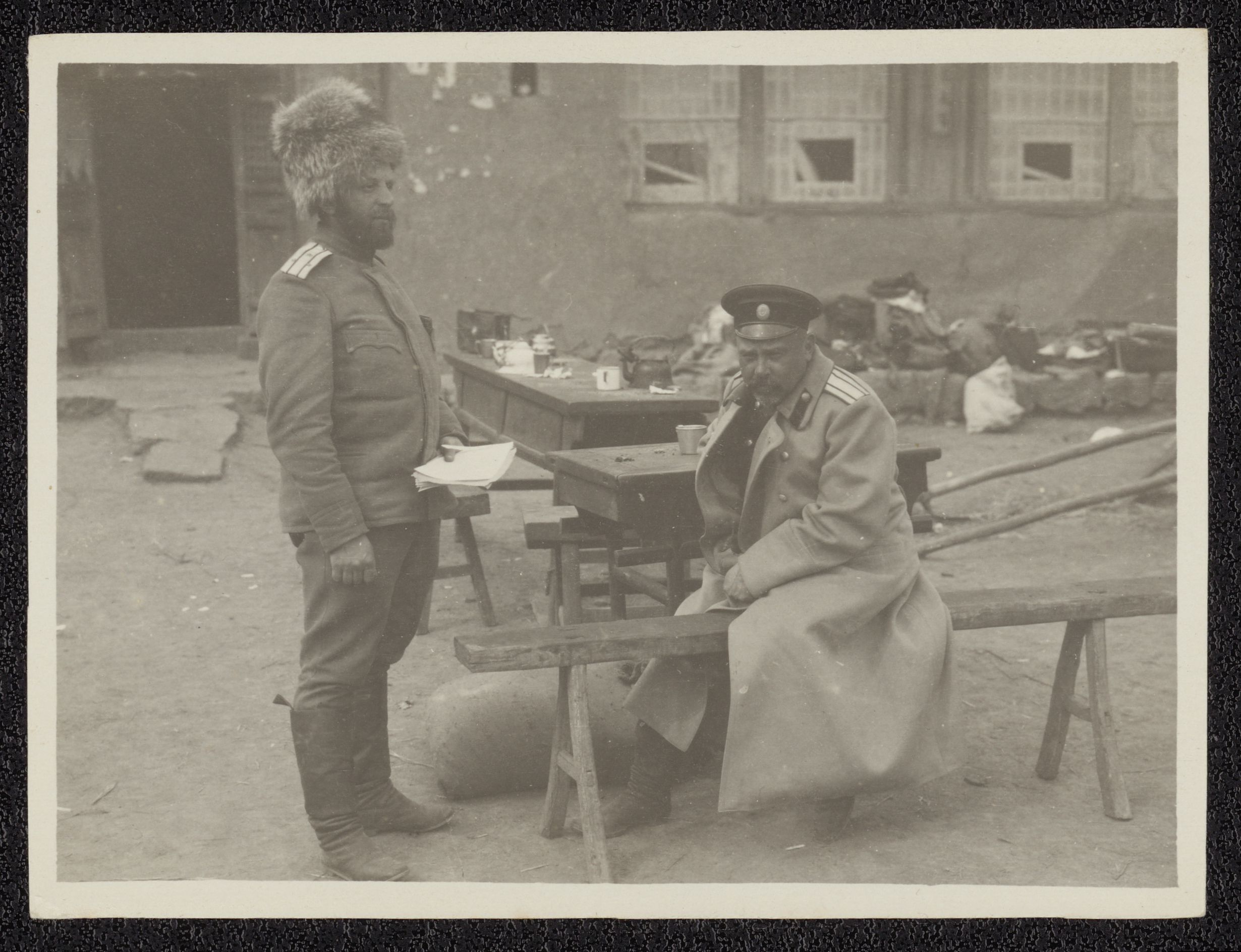 En oberstløjtnant med pelshue står med papirer i hånden, foran ham sidder en oberst med kasket og kigger mod fotografen.