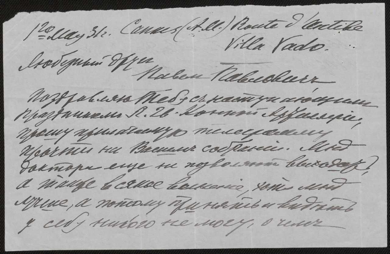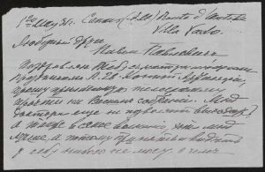 приложенную телеграмму прочти на Высшемъ собраніи. Мнѣ доктора еще не позволяютъ выхода! А также всякое волненіе, хоть мнѣ лучше, а потому принять и видѣть у себя никого не могу, о чемъ (…)
