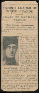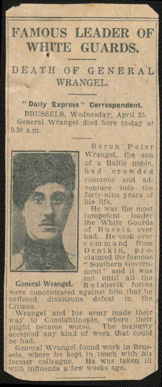 Nekrolog over general Wrangel, (Баро́н Пётр Никола́евич Вра́нгель), 1878-1928. Fra Gudim-Levkovitj' Samling.