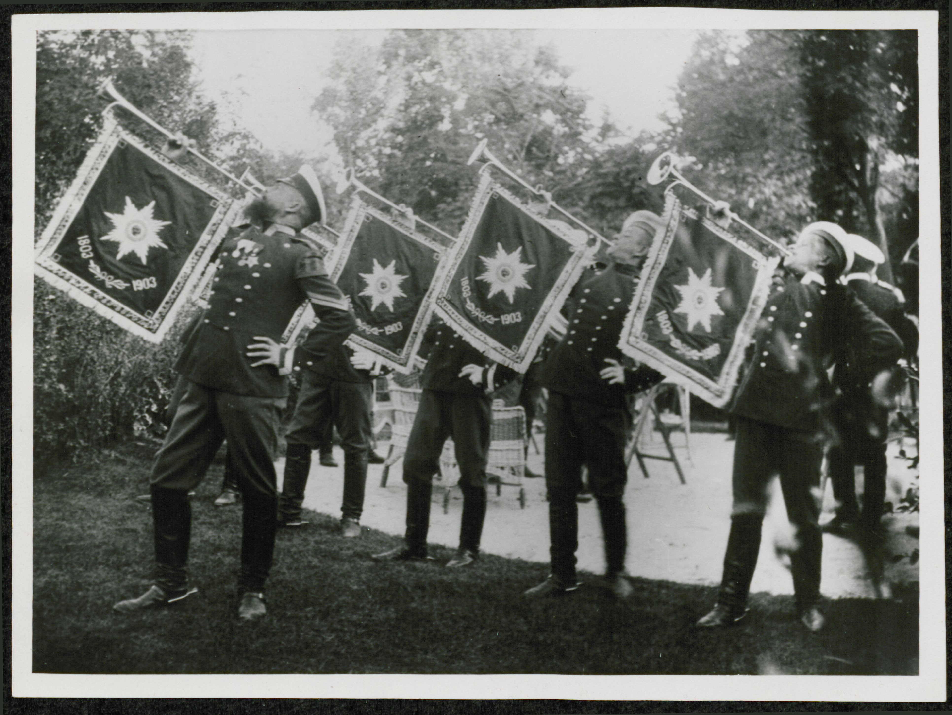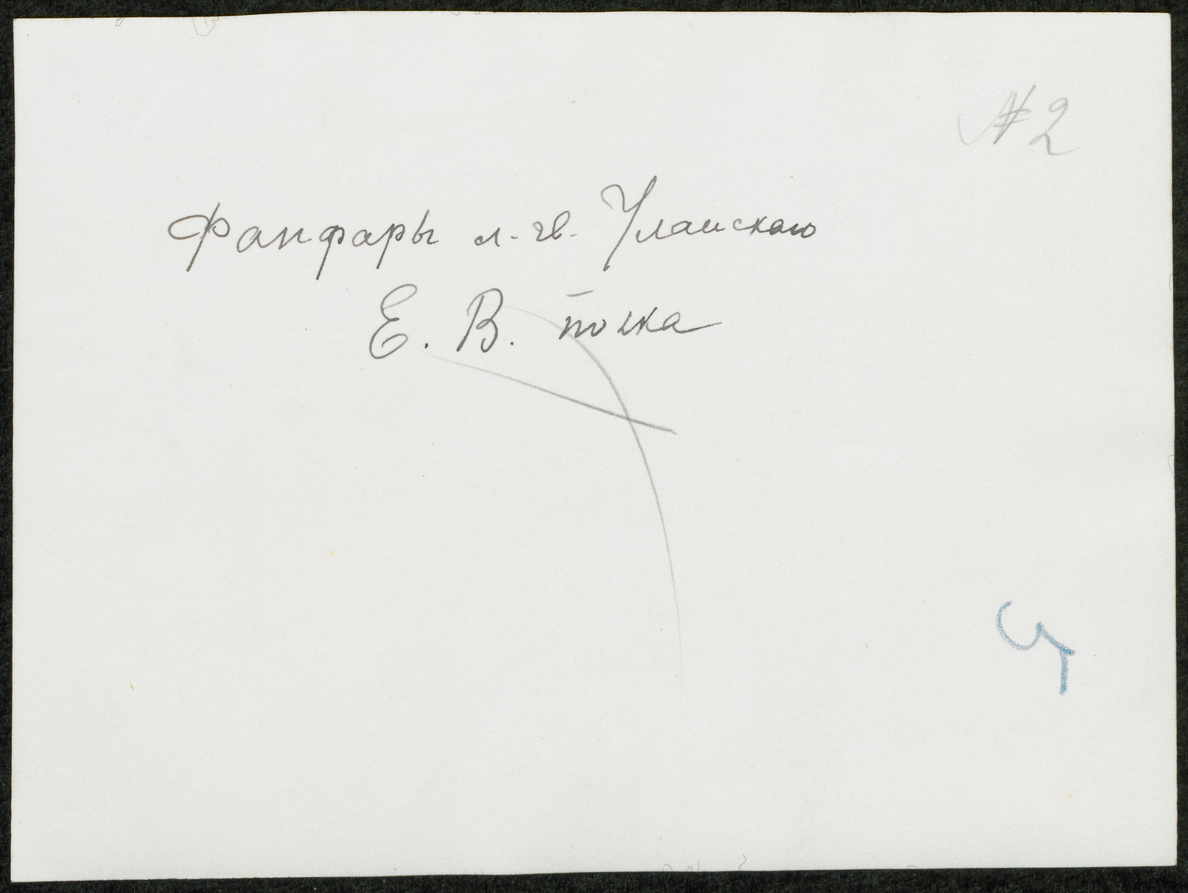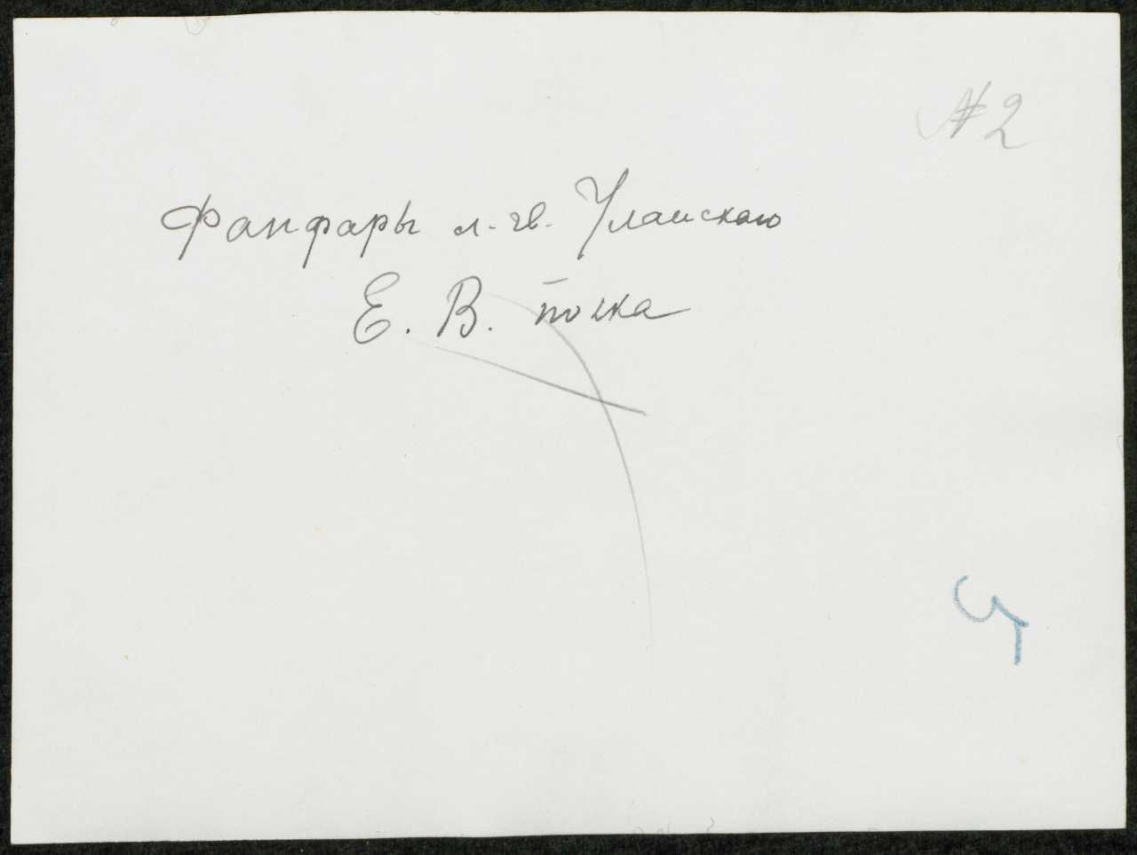 Fanfareblæsere fra Livgardeulanregimentet. Tekst på bagside: "Фанфари лейбъ гвардiи уланского Его Величества полкъ " Fra Gudim-Levkovitj' Samling.