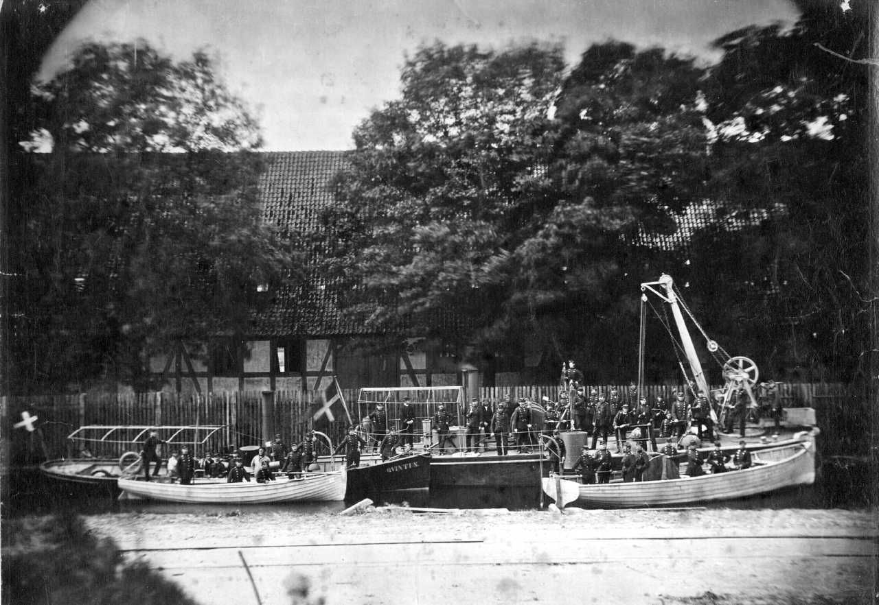 Foto: Minekran No 1, 1872 set mod styrbord. Foran denne dampbåd "Quintus" samt to rofartøjer. Alle bemandet med ingeniørsoldater. Ramme, flad mahogni.
