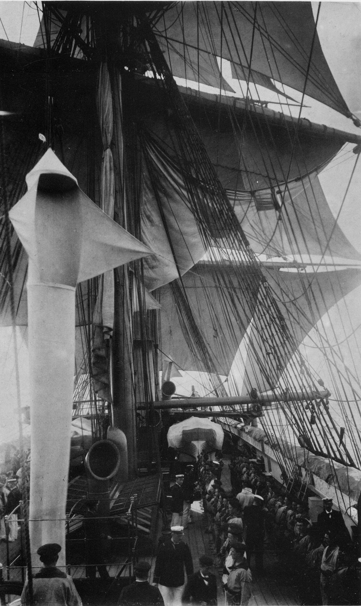 "Fyen" i Vestindien. Foto: Våbenparade på styrbords dæk set fra hyttedækket.