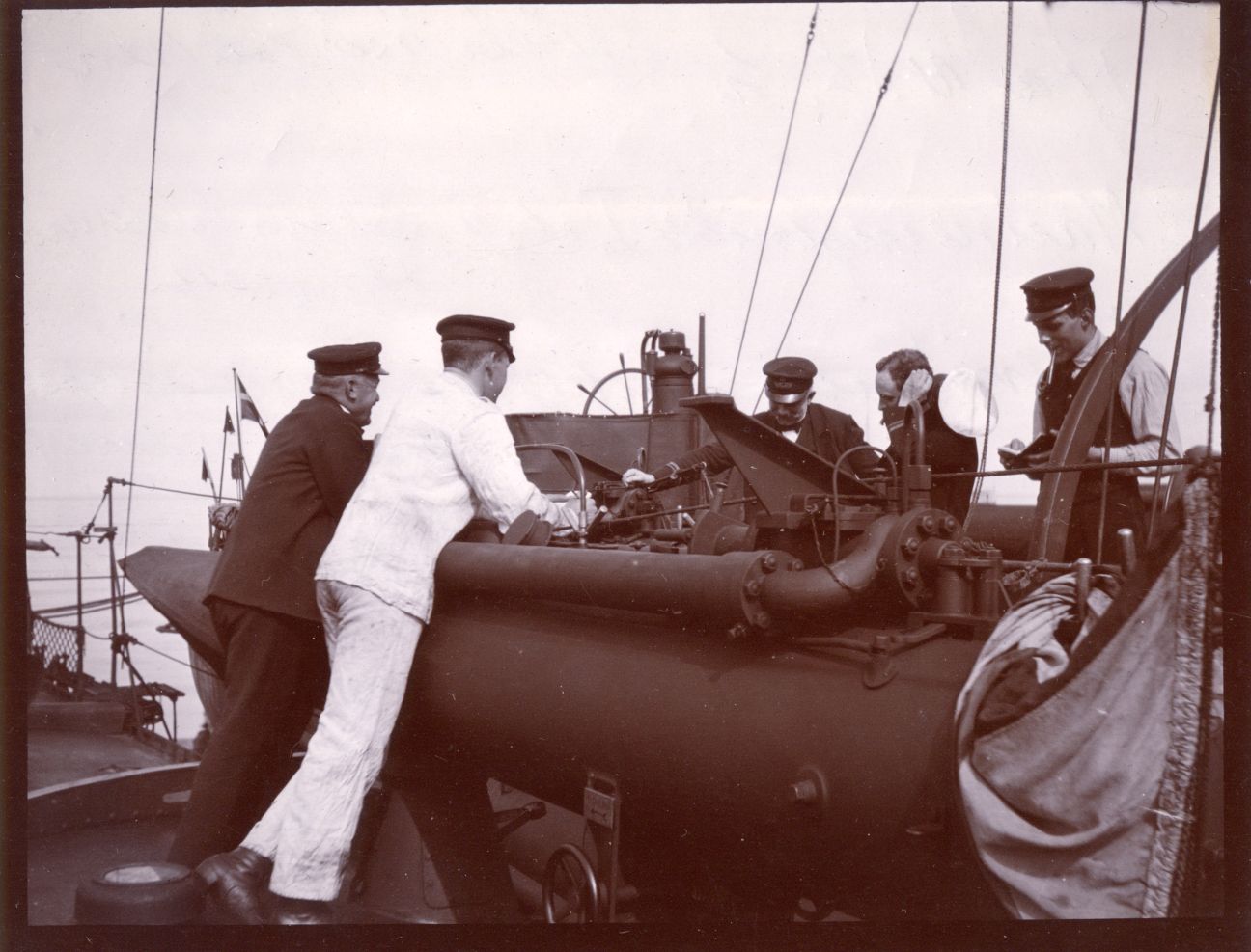 Foto: Gruppebillede. Studie af Apparat (?) om bord i torpedobåd af Tumleren-klassen.