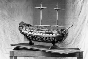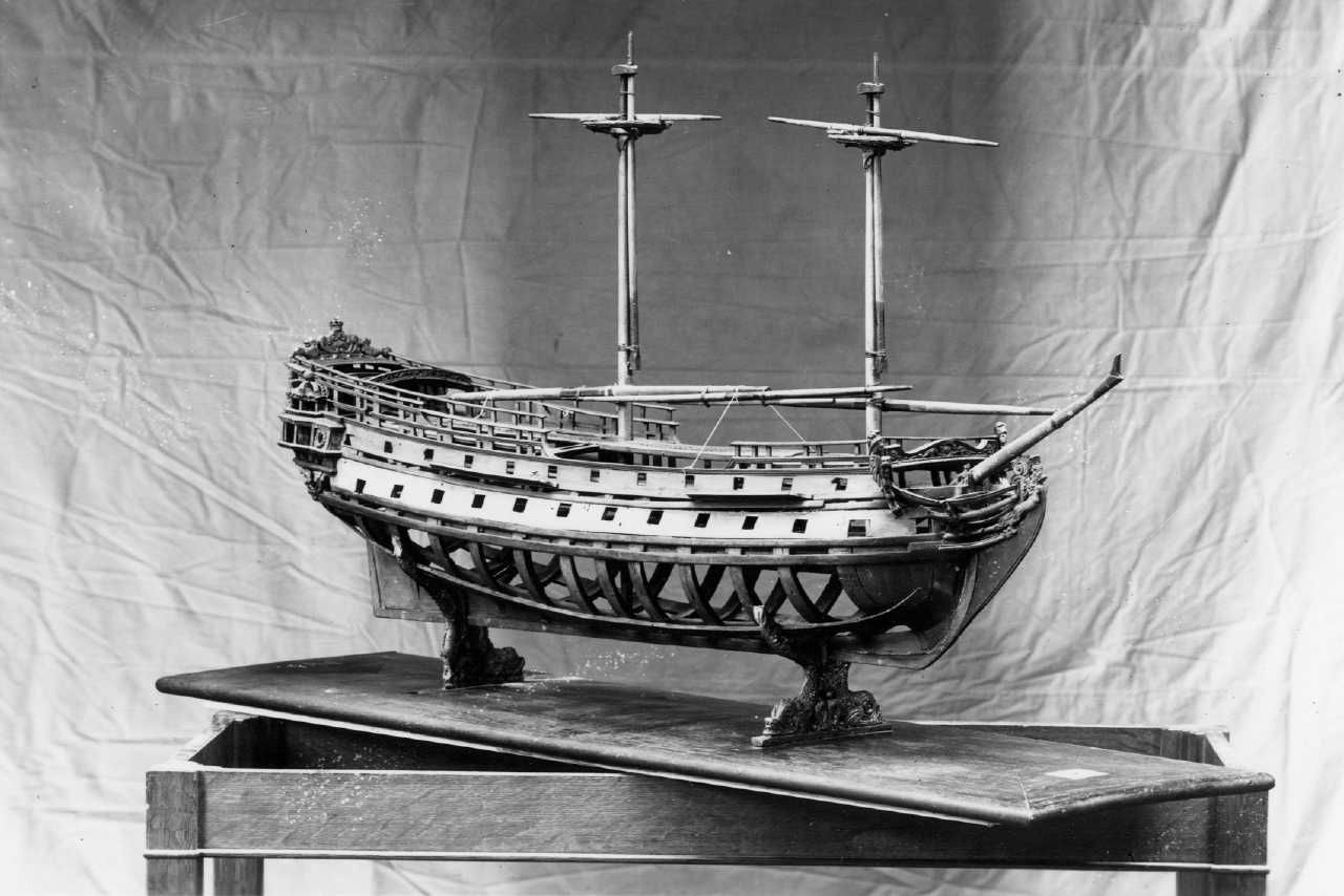 Foto: Model af "Tre Løver" opr. bygget 1689, med aftaklede master og uden bordplanker.