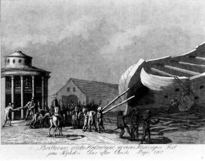 Foto: Af flyveblad 1807-14. Text: "Britternes sidste heltedåd og deres Høvdingers Fest paa Nÿeholm Aar efter Christi Bÿnd 1807". Tegning: viser englændernes hærgen, til venstre ses to mænd i færd med at ødelægge rotunden for enden af "Planen". Til højre et ikke færdigbygget skib væltet af stabelen. Der ses et skjold med texten: Gammel Englands hæder knust 1807.