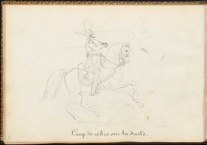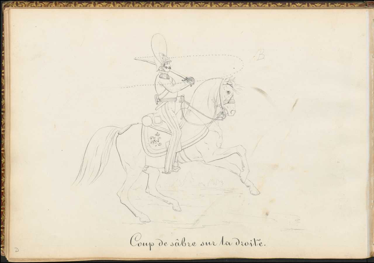 Trykt manual for russisk garde-kavalleri, med delvist kolorerede illustrationer, ca. 1830. Fransk tekst. Fra Gudim-Levkovitj' Samling.