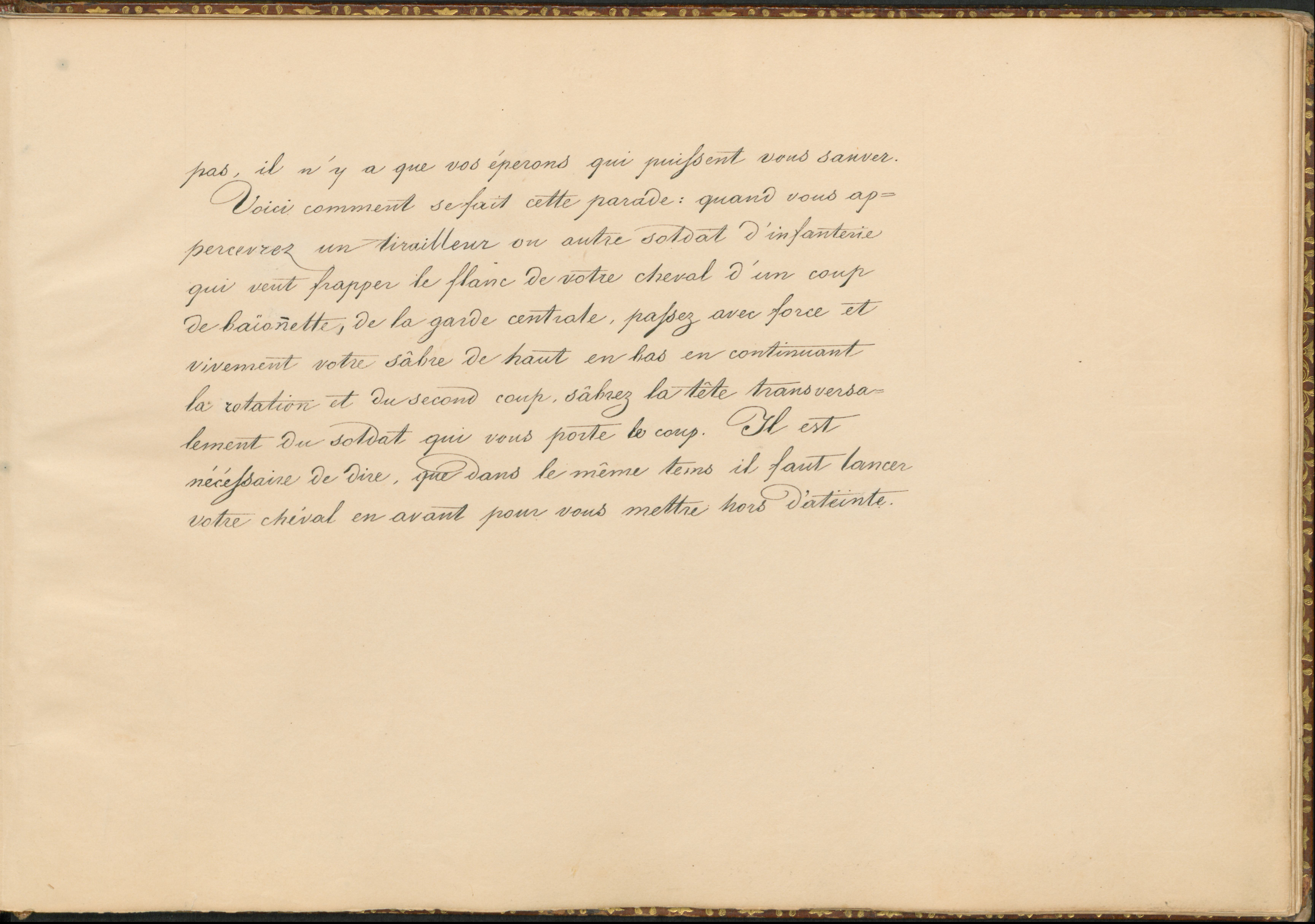 Trykt manual for russisk garde-kavalleri, med delvist kolorerede illustrationer, ca. 1830. Fransk tekst. Fra Gudim-Levkovitj' Samling.