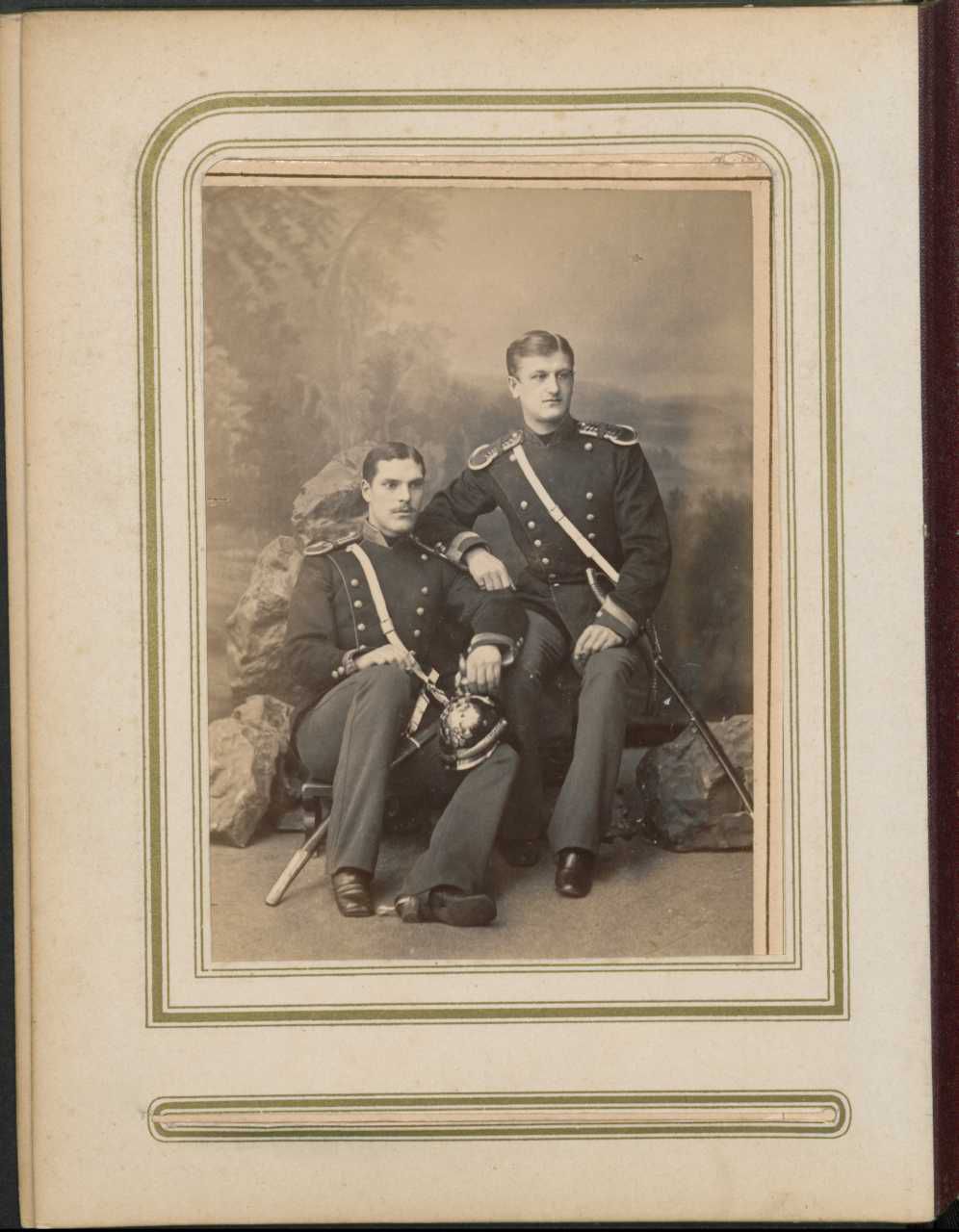 Fotoalbum med billeder af kadetter fra Nikolaj Kavaleri-skolen, ca. 1880. Hver tirsdag var der en parade i Manegebygningen i Sankt Petersborg, og de forskellige gardekorps og -skoler sendte hver nogle soldater til denne. Paraderne blev overværet af kejseren (Alexander 2.). Nikolaj Kavaleri-skolen sendte hver gang en officer, en underofficer og en elev (junker). Når paraden var overstået, gik disse tre hver gang til fotografen og fik taget et gruppebillede. Disse billeder er indsat i et album sammen med enkelte andre i slutningen af albummet, som tilsyneladende ikke har noget med skolen at gøre.