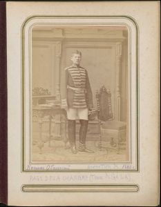 Fotoalbum med billeder af kadetter fra Nikolaj Kavaleri-skolen, ca. 1880. Hver tirsdag var der en parade i Manegebygningen i Sankt Petersborg, og de forskellige gardekorps og -skoler sendte hver nogle soldater til denne. Paraderne blev overværet af kejseren (Alexander 2.). Nikolaj Kavaleri-skolen sendte hver gang en officer, en underofficer og en elev (junker). Når paraden var overstået, gik disse tre hver gang til fotografen og fik taget et gruppebillede. Disse billeder er indsat i et album sammen med enkelte andre i slutningen af albummet, som tilsyneladende ikke har noget med skolen at gøre.