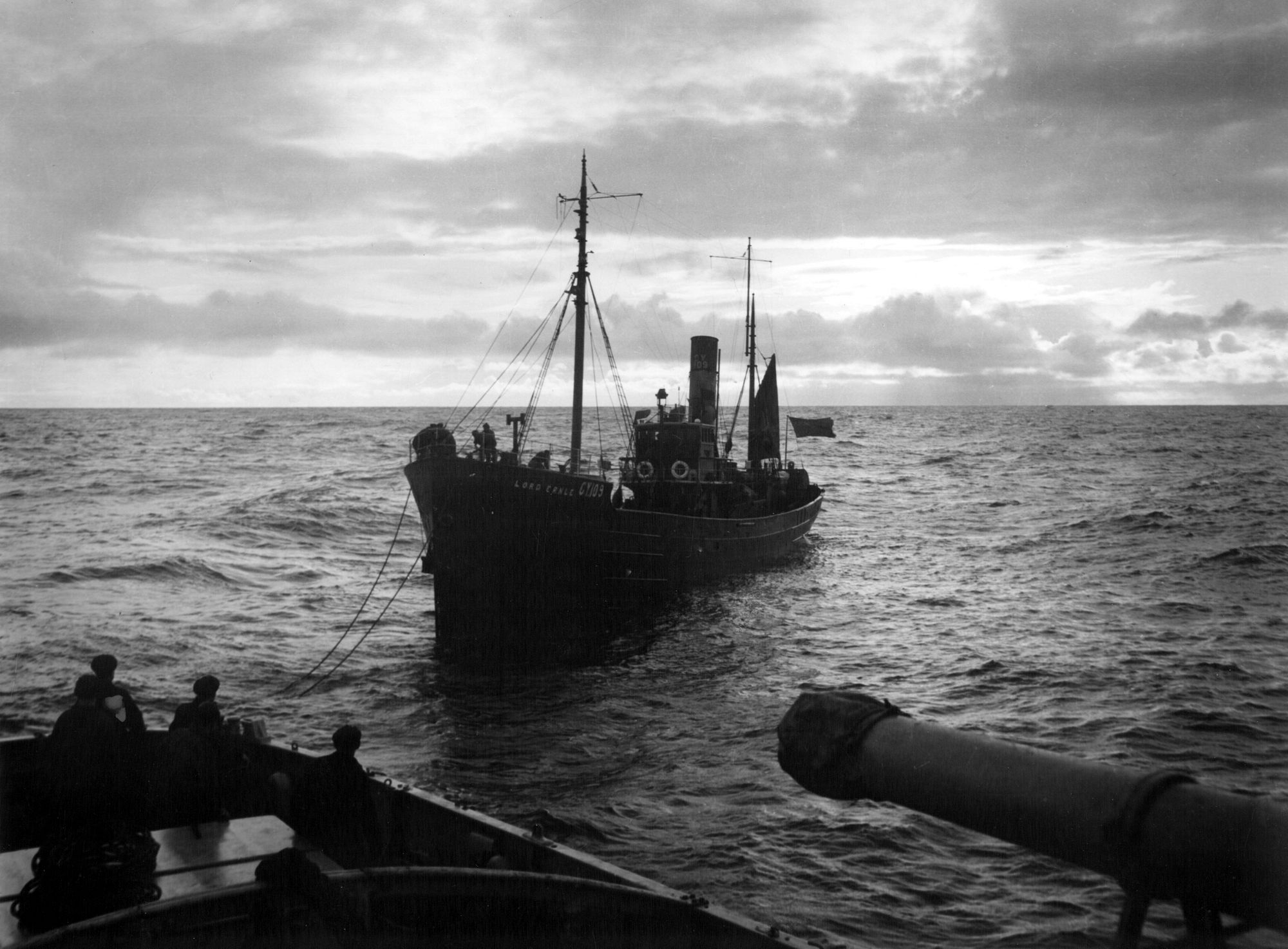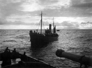 Foto: Engelsk trawler "Lord Ernle" der havde mistet skruen, taget på slæb af "Fylla" i Danmarksstrædet og bugseret til Reykjavik, sommer 1931.