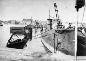 Foto: Ubådene "Dryaden" (bygget 1926) og "Flora" (bygget 1920), stående på bunden ved sydlige ubådsbro (efter 29. aug. 1943.