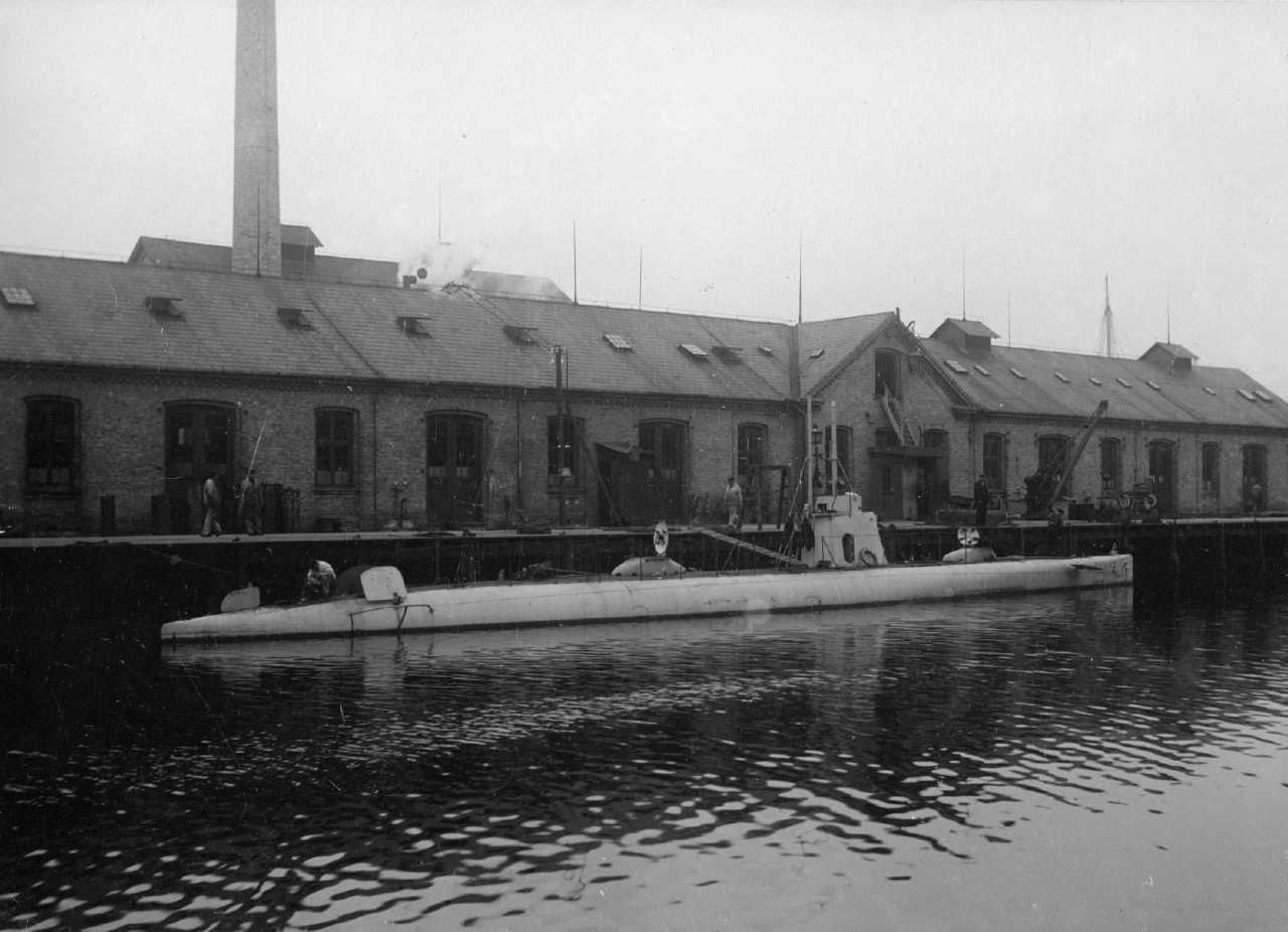 Foto: Ubåden "Dykkeren" (1909-1917) i Søminegraven. I ramme 24x28 cm. Identisk med foto i "Orlogsværftets historie" 1924, side 97. 24,3x28,2 cm.