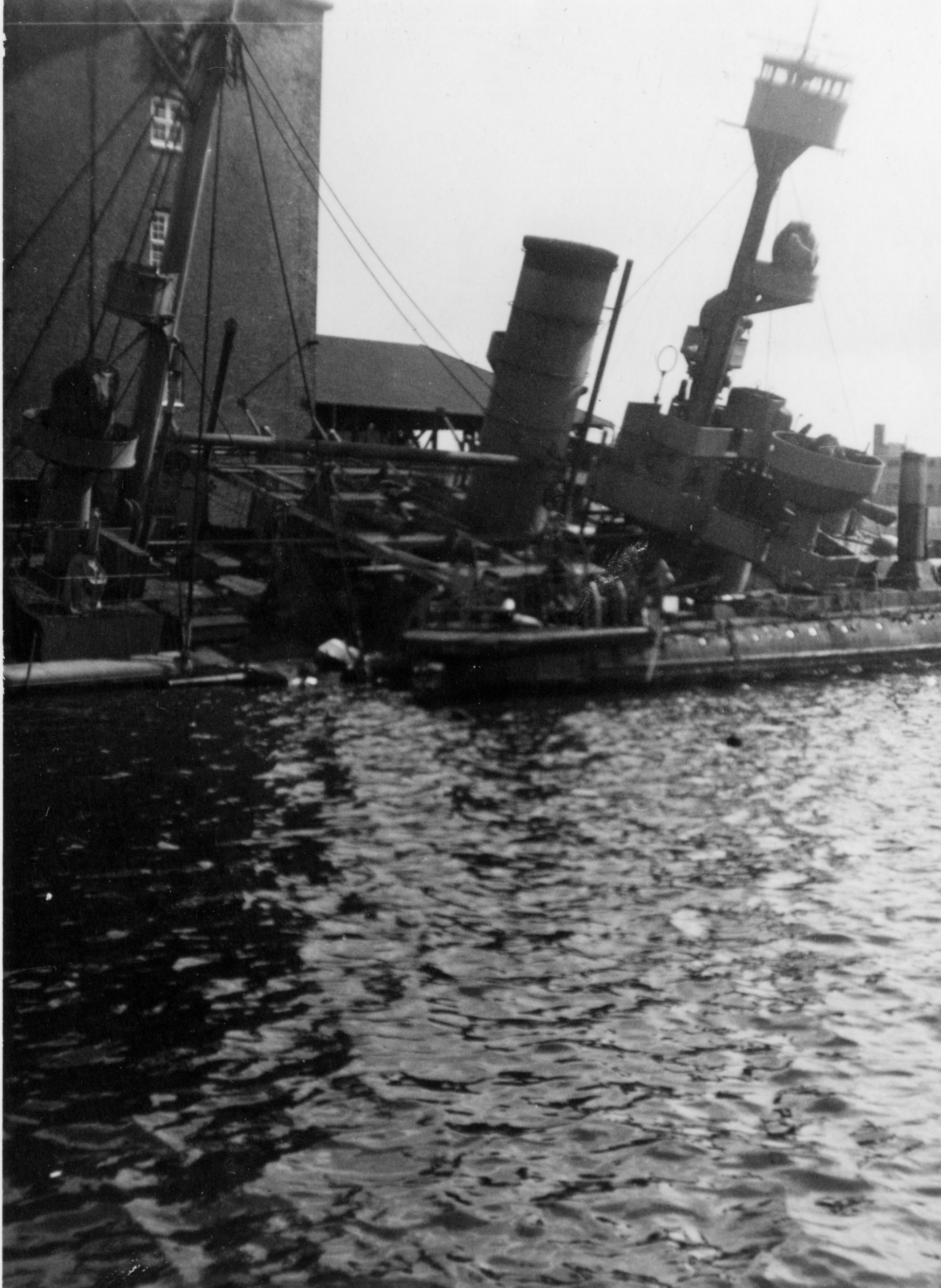 Foto: "Peder Skram", midtskibet; synkende ved Nyholms kran, set agten for tværs mod styrbord.