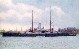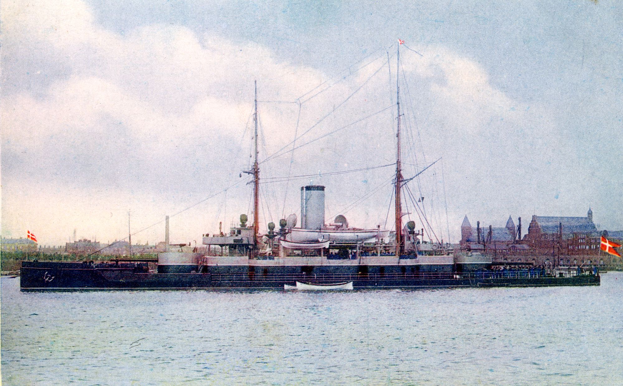 Postkort koloreret: "Olfert Fischer" (1903-1936) set mod bagbord.