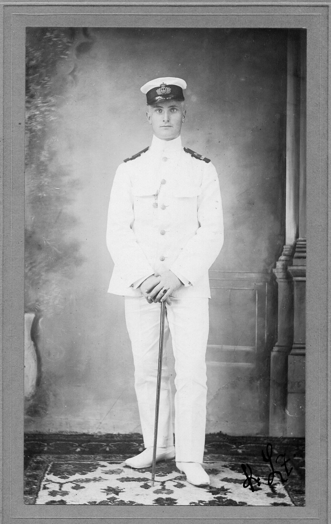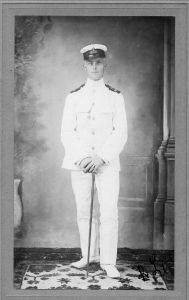 Foto: 1909-10 under Skonnerten Ingolfs togt til vestindien. Kommandørkaptajn von Lowzow Sekondløjtnant i tropeuniform- jakke med opstående krave.